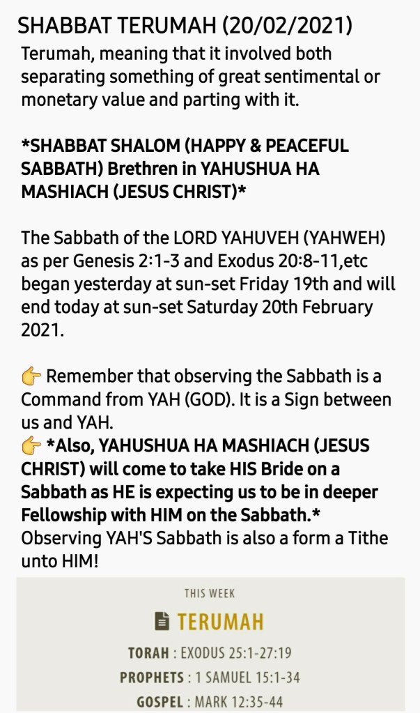 Shabbat is a day to spend much more quality time with YAH ALMIGHTY than on the other days of the week, HalleluYAH for Shabbat is the Set Apart Day of YAH ALMIGHTY! YAH’S Shabvat weekly falls on Saturdays. It is not a day to go about business as usual because it is set apart by YAH ALMIGHTY.