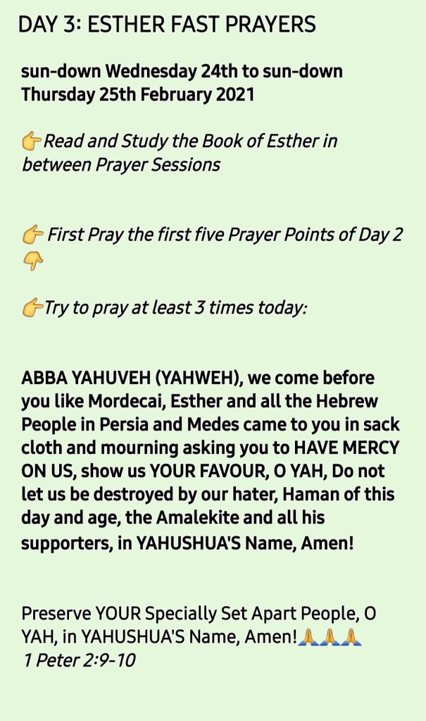 Shalom Brethren in YAHUSHUA HA MASHIACH, we are now on our third day of fast of Queen Esther. The Festival of Purim is now fast approaching as it commences tomorrow (Thursday 25th February 2021) at sun-down.