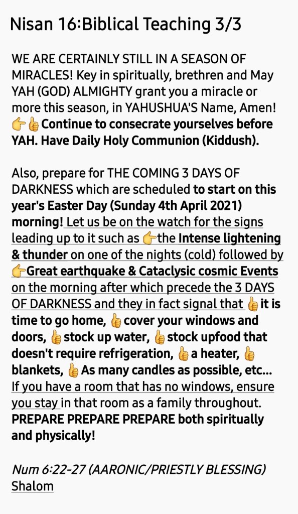 Notice that THE COMING 3 DAYS OF DARKNESS occur during THE FESTIVAL OF UNLEAVENED BREAD & COUNTING OF THE OMER SEASONS. These are seasons of deeper Consecration unto YAH ALMIGHTY than usual. It certainly makes sense for The 3 Days of Darkness to occur then also as it is all about REPENTANCE and REFINEMENT!