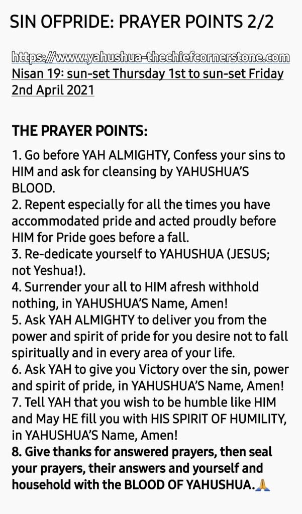 6. Ask YAH to give you Victory over the sin, power and spirit of pride, in YAHUSHUA’S Name, Amen!