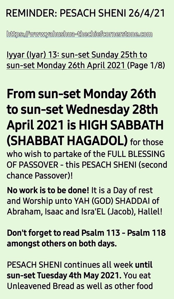 Iyyar (Iyar) 21: sun-set Sunday 2nd to sun-set Monday 3rd May 2021 is a High Sabbath also!