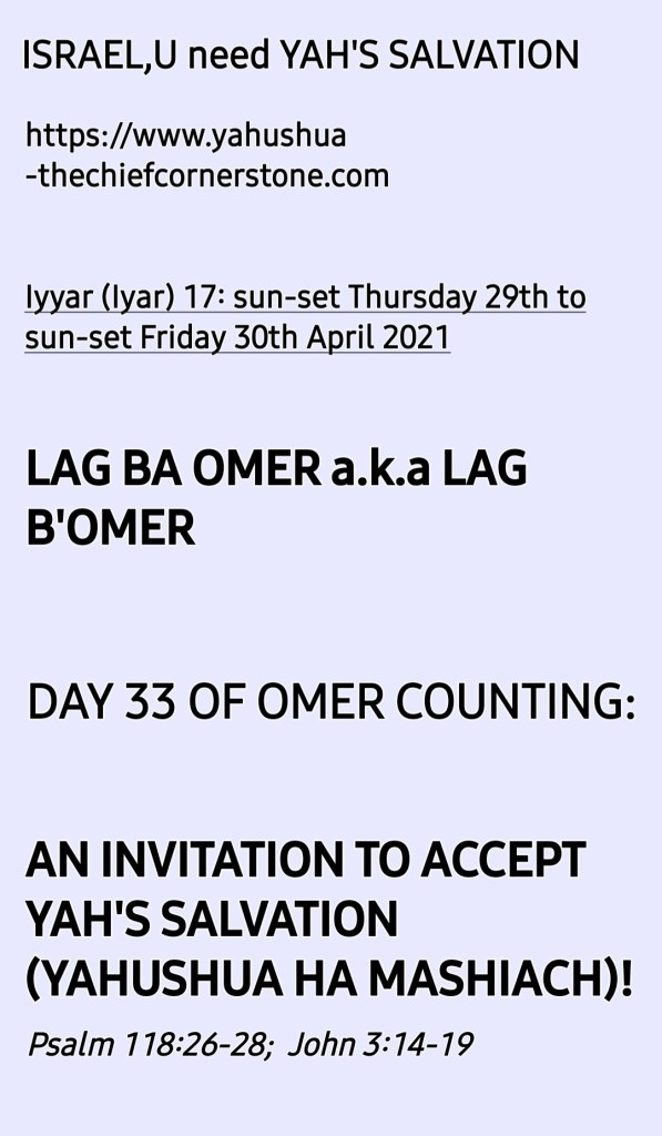 https://yahushua-thechiefcornerstone.com/lag-bomer-ba-omer-day-33-omer-counting-an-invitation-by-yahuveh-yahweh-a-k-a-hashem-to-accept-his-salvation-yahushua-the-only-true-mashiach-messiah/