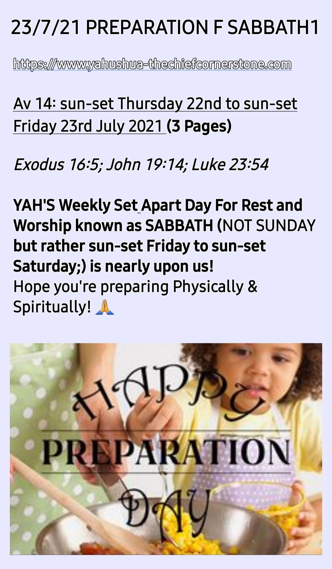 Shalom and HAPPY PREPARATION FOR YAH’S SHABBAT! Note that this day is related to Matthew 25:1-13 hence it is not to be taken for granted!