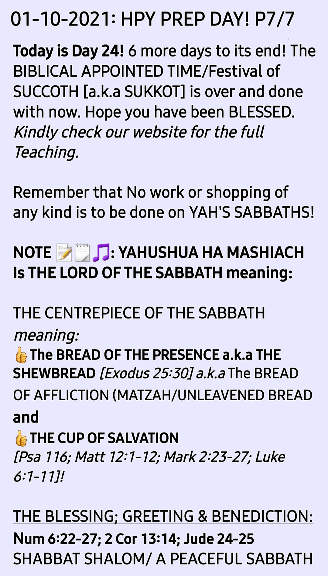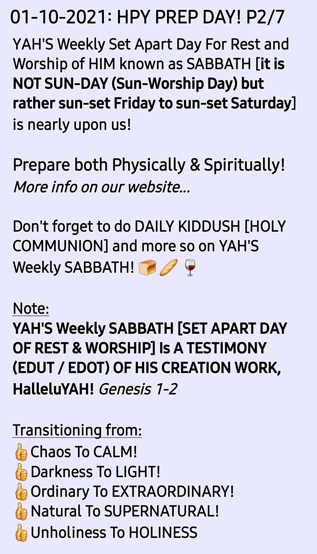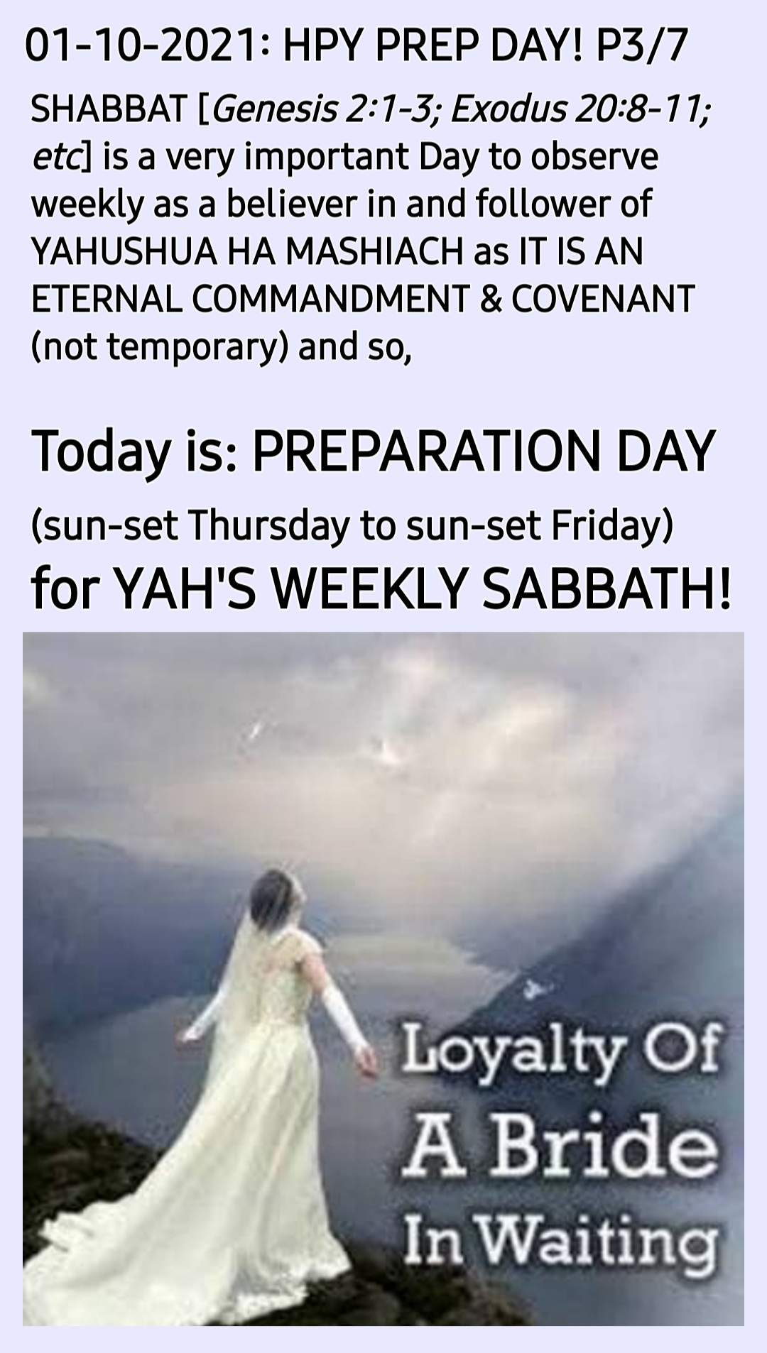 1. PREPARATION DAY (6th Day Weekly) and YAH’S SABBATH (SHABBAT: 7th Day Weekly)
