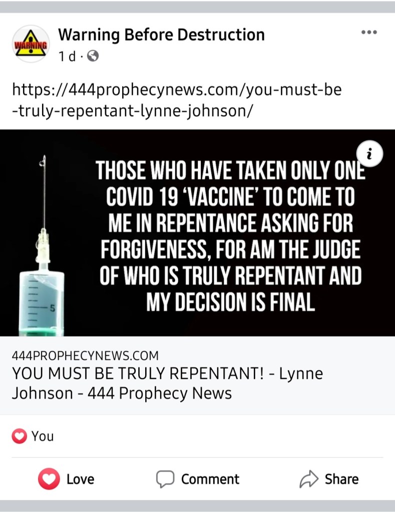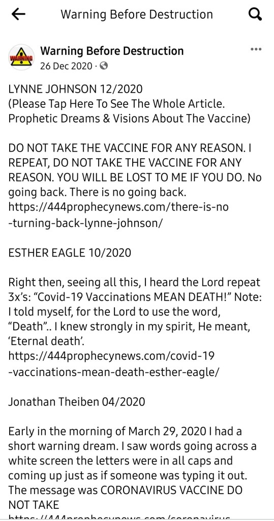 Right then, seeing all this, I heard the Lord repeat 3xâs: âCovid-19 Vaccinations MEAN DEATH!â Note: I told myself, for the Lord to use the word, âDeathâ.. I knew strongly in my spirit, He meant, âEternal deathâ. https://444prophecynews.com/covid-19-vaccinations-mean-death-esther-eagle/
