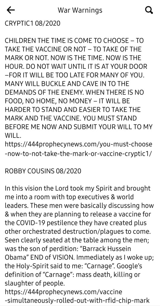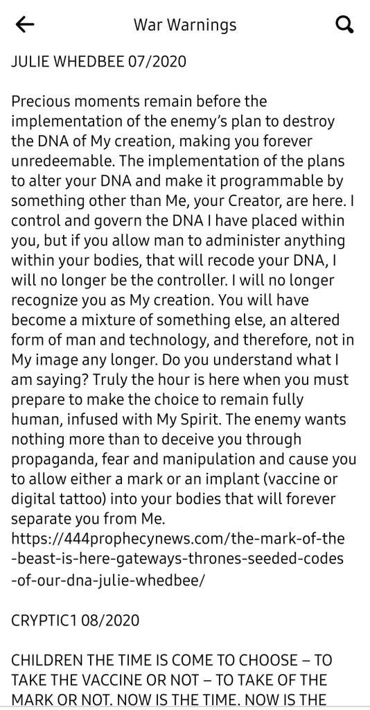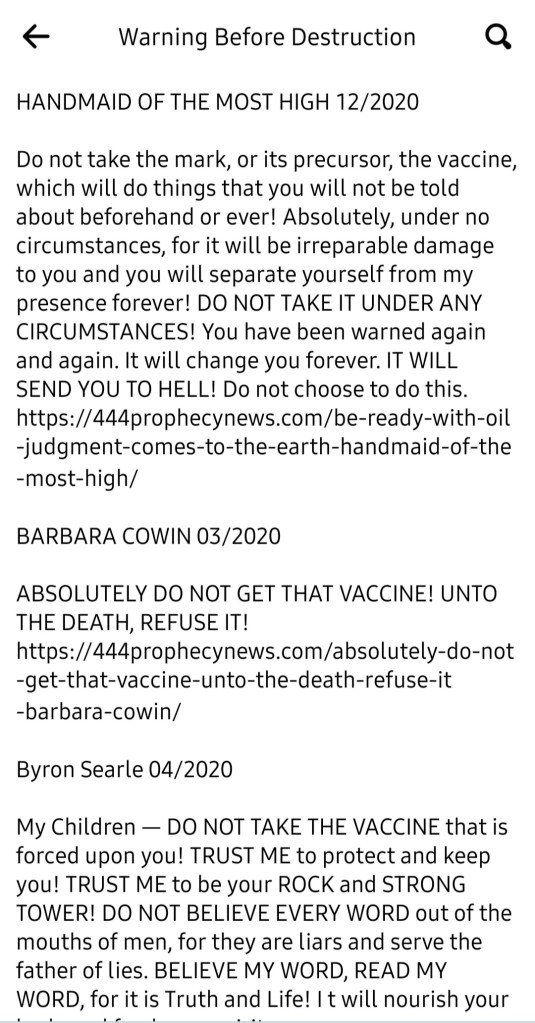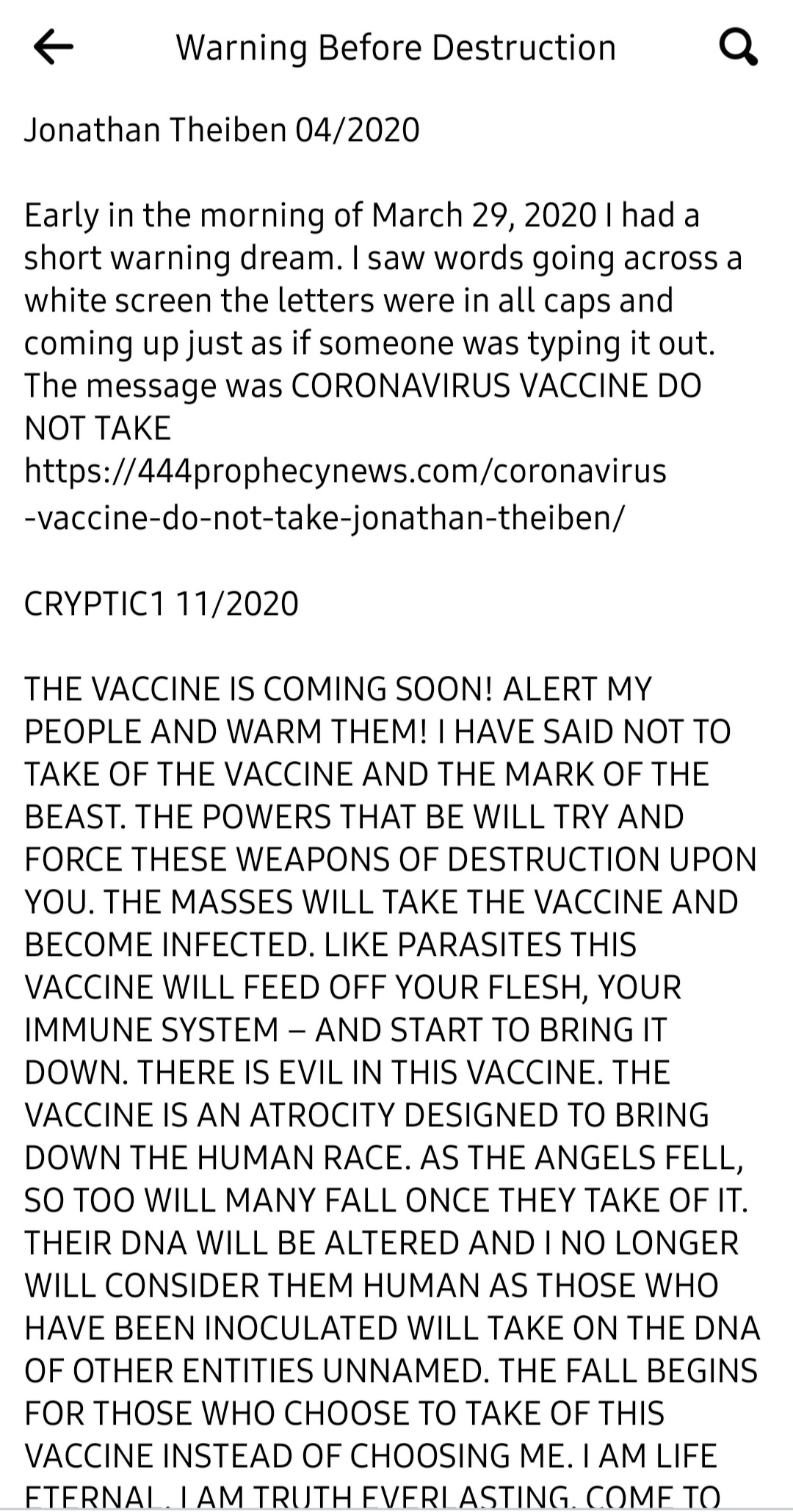 Early in the morning of March 29, 2020 I had a short warning dream. I saw words going across a white screen the letters were in all caps and coming up just as if someone was typing it out. The message was CORONAVIRUS VACCINE DO NOT TAKE https://444prophecynews.com/coronavirus-vaccine-do-not-take-jonathan-theiben/
