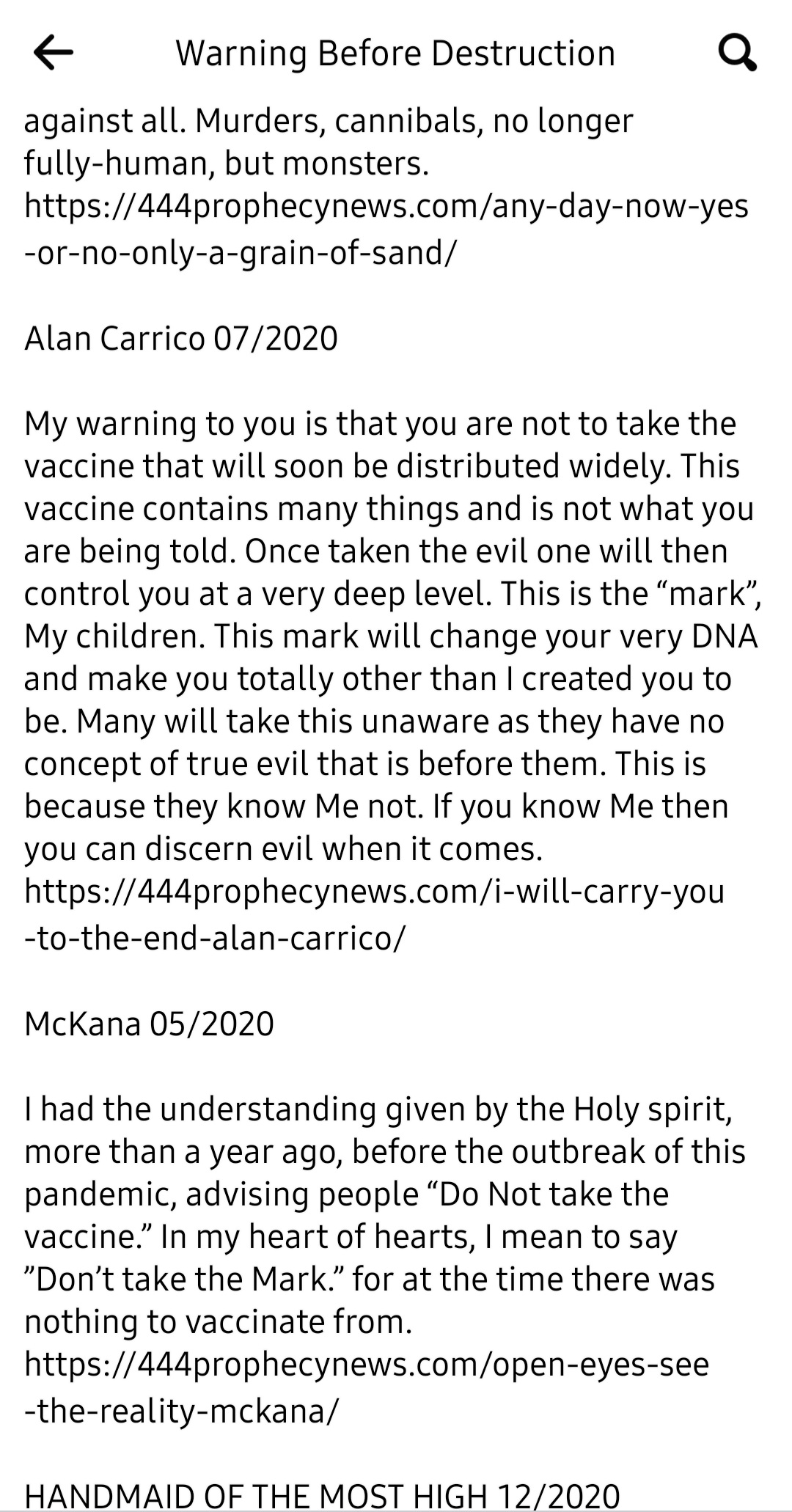 My warning to you is that you are not to take the vaccine that will soon be distributed widely. This vaccine contains many things and is not what you are being told. Once taken the evil one will then control you at a very deep level. This is the âmarkâ, My children. This mark will change your very DNA and make you totally other than I created you to be. Many will take this unaware as they have no concept of true evil that is before them. This is because they know Me not. If you know Me then you can discern evil when it comes. https://444prophecynews.com/i-will-carry-you-to-the-end-alan-carrico/
