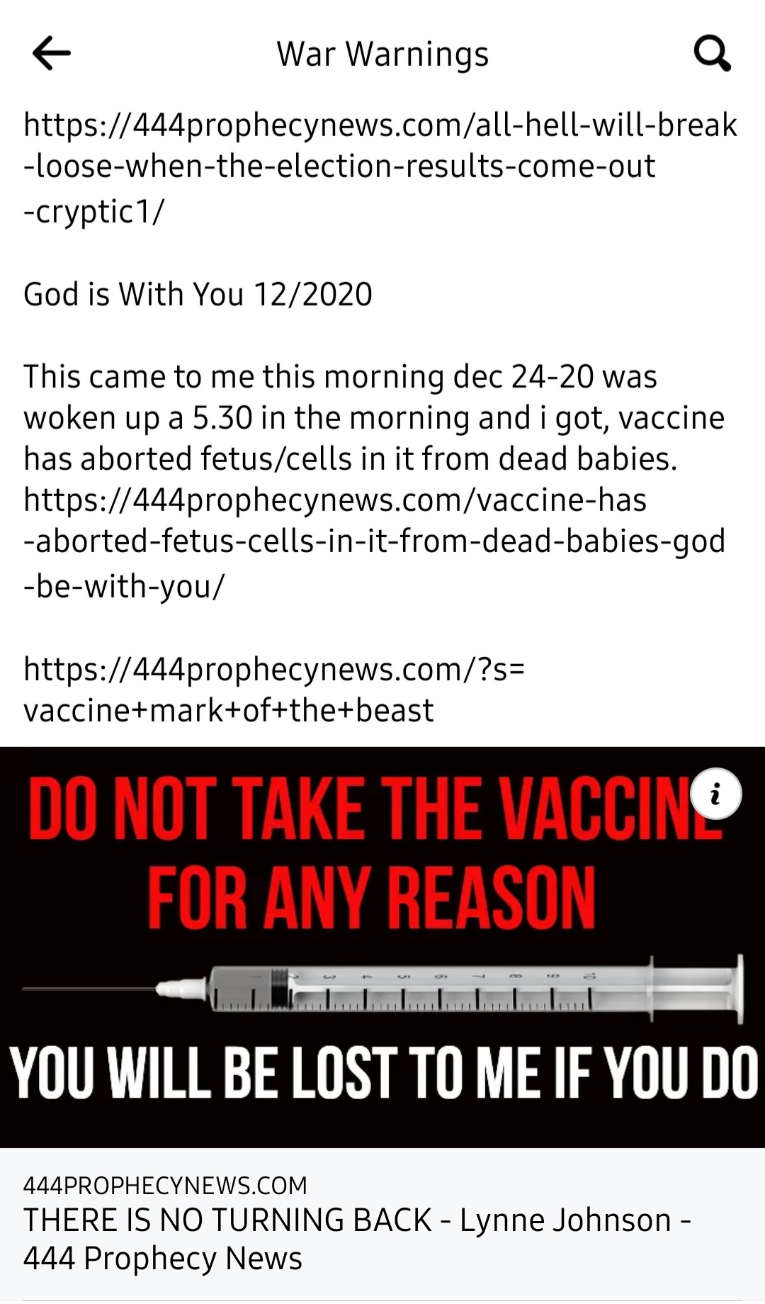 This came to me this morning dec 24-20 was woken up a 5.30 in the morning and i got, vaccine has aborted fetus/cells in it from dead babies. https://444prophecynews.com/vaccine-has-aborted-fetus-cells-in-it-from-dead-babies-god-be-with-you/