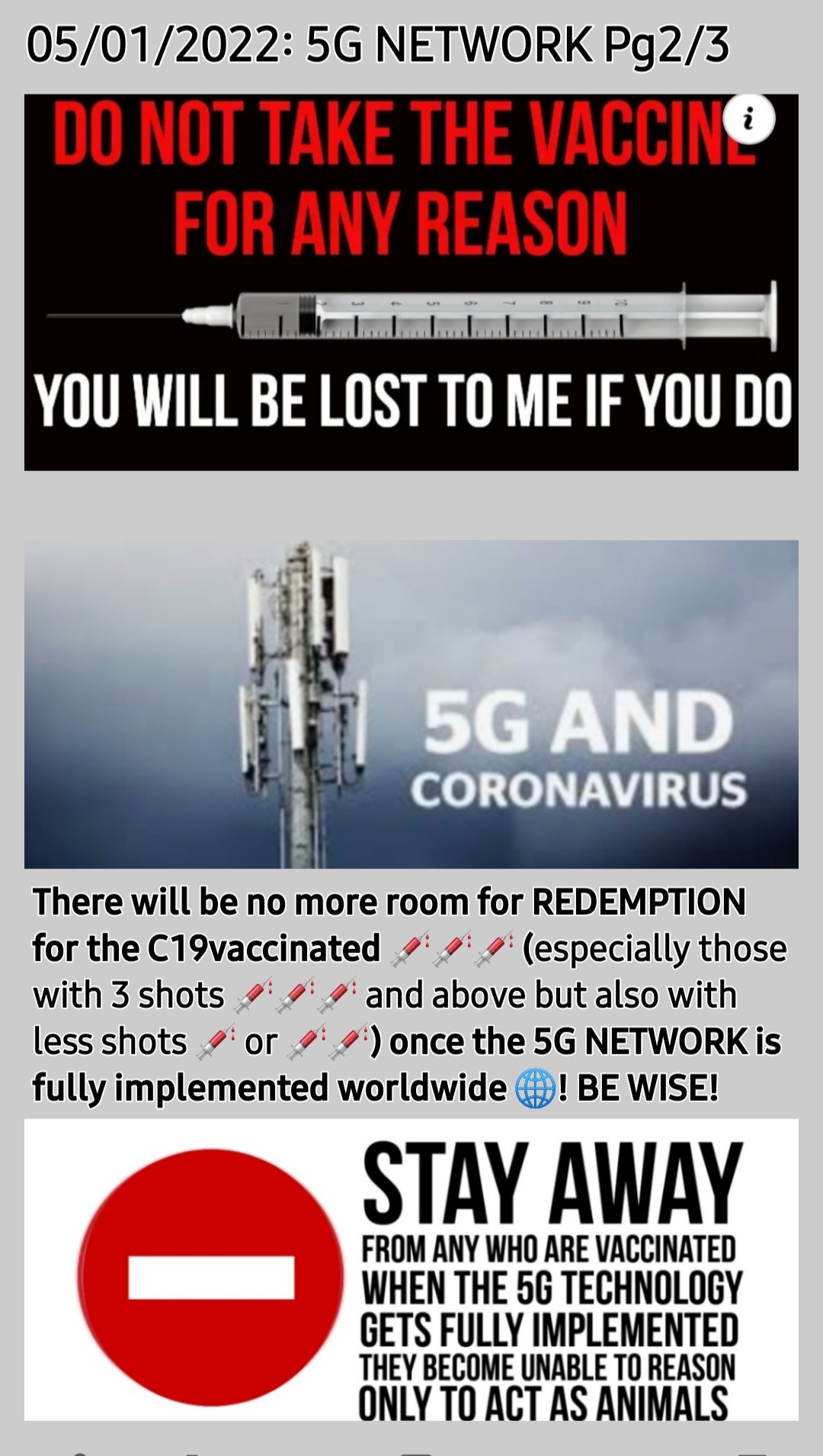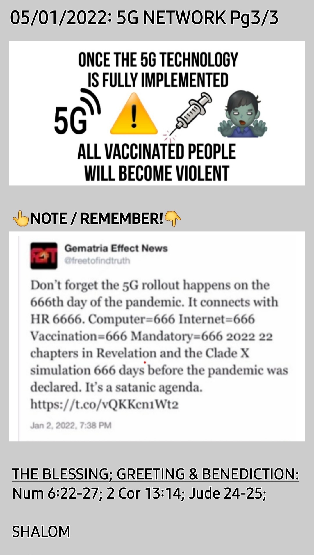 *Today, Wednesday 5th January 2022 / SHEVAT 3 is THE OFFICIAL DATE FOR SWITCHING ON THE wicked 5G NETWORK!* This is a very dangerous network as it is a killer machine! It is ha satan’s inspiration in order to depopulate the world đ as much as possible. It drains the body so much more and is related to the COVID-19 Pandemic as it makes one to become more unwell. Being close to one of the 5G masts is absolutely unhealthy!