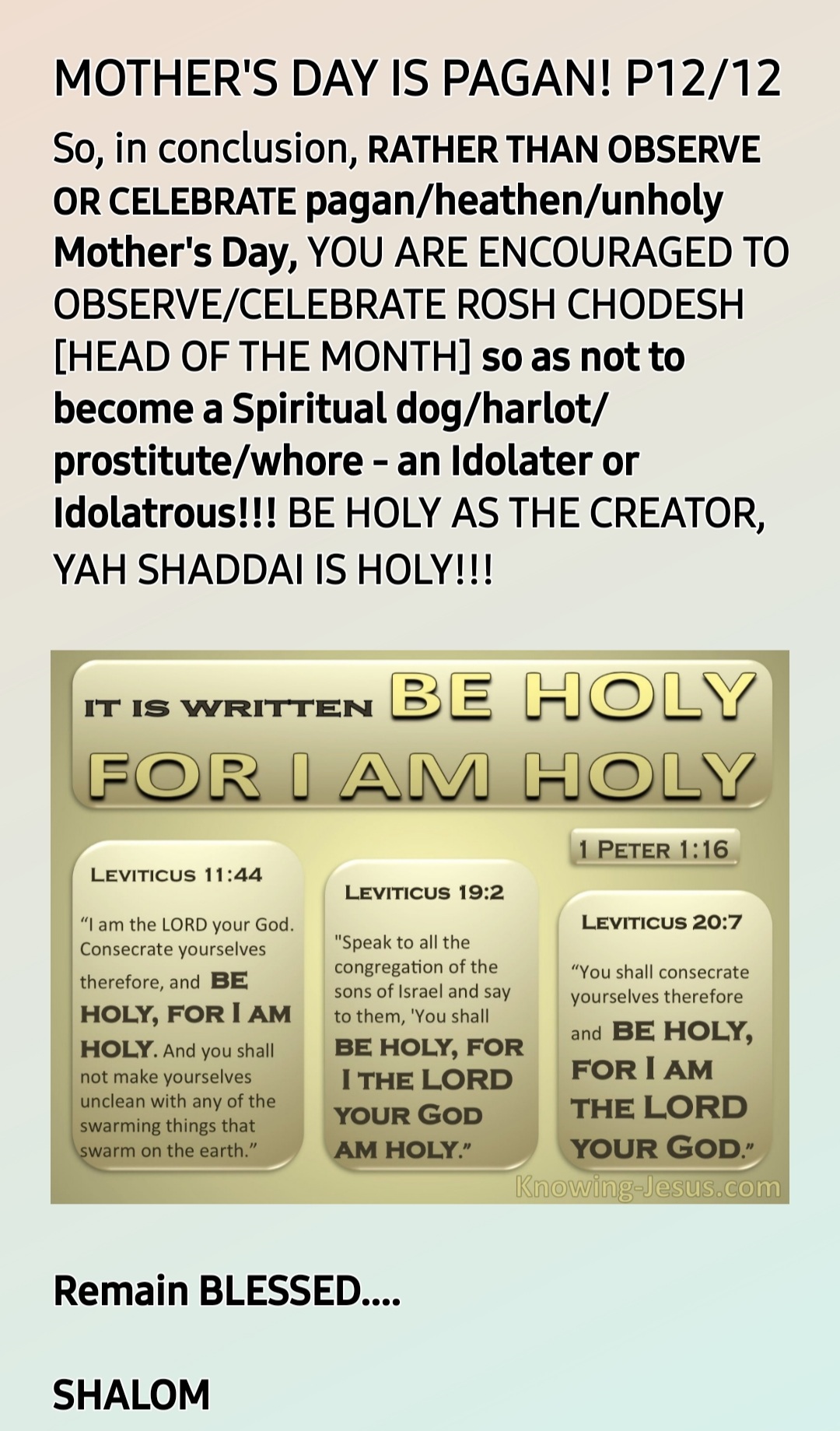 In order to understand YAH’S HOLINESS and observe it accordingly, you have to start by forsaking Sun-Day Worship and embracing Saturday Worship rather!!!