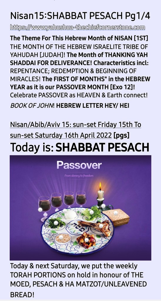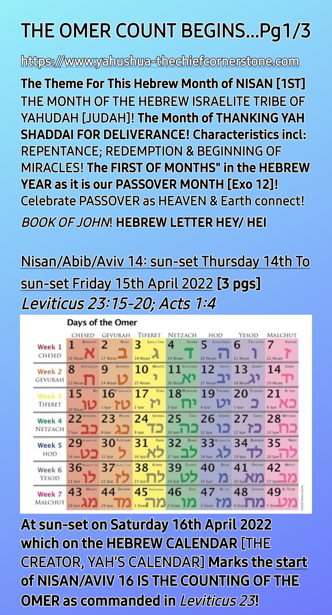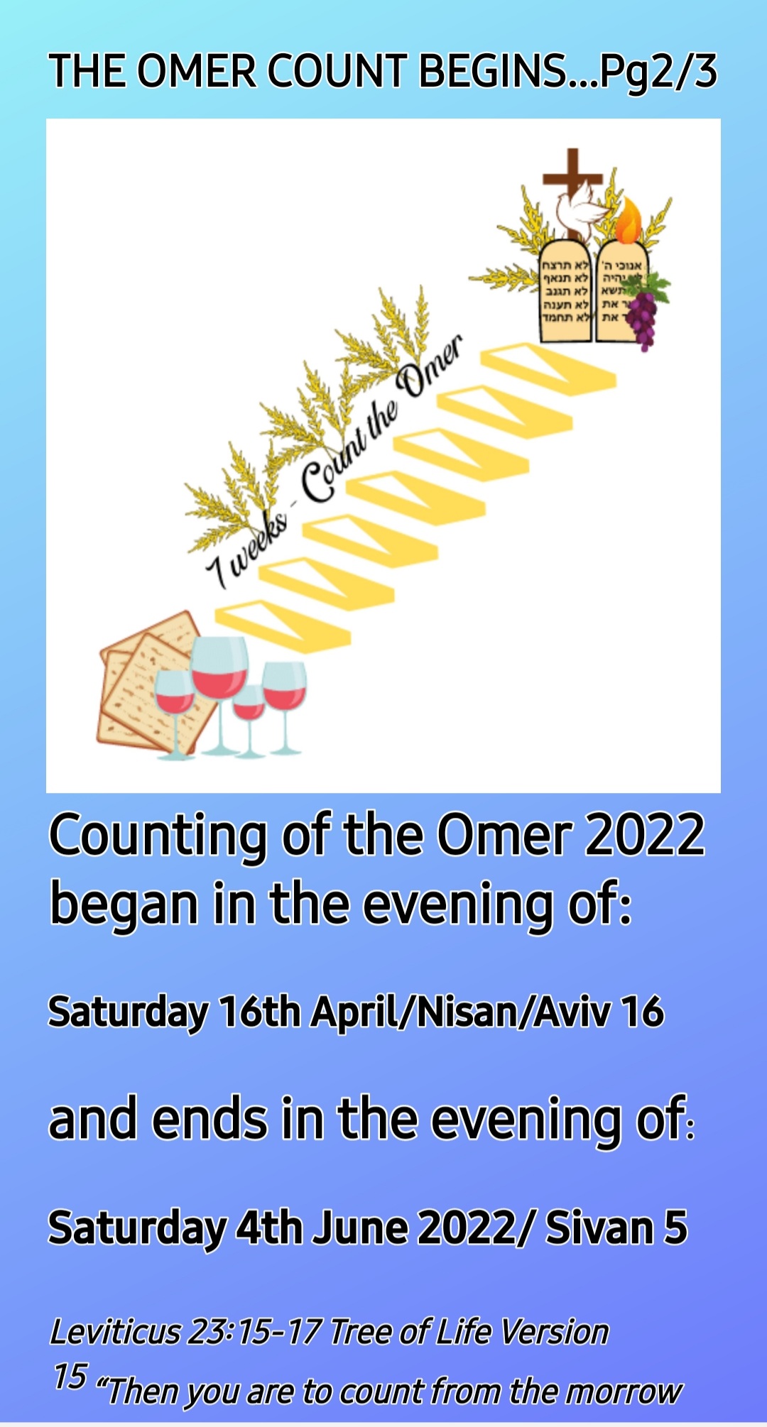 1. SHABBAT PESACH [PASSOVER DAY 2] and HA MOED HA MATZTOT/ UNLEAVENED BREAD Day 1 [sun-set Friday 15th To sun-set Saturday 16th April 2022/ NISAN/AVIV 15] Followed By 2. THE BEGINNING OF THE OMER COUNT [sun-set Saturday 16th April To sun-set Saturday 4th June 2022/Sivan 5]!