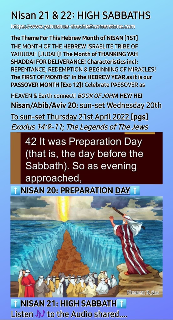 NISAN/AVIV 20: HAPPY PREPARATION DAY FOR THE CREATOR, YAH’S SABBATHS! ….AUDIO Explaining in Summary Shared…. 2. NISAN 21 [Friday 22nd April 2022] and NISAN 22 [Saturday 23rd April 2022] ARE HIGH SABBATHS! 3. “THE Sin of Pride Is THE FOUNDATIONAL Sin of Every Sins! HOW DOES THIS RELATE TO PASSOVER/PESACH and UNLEAVENED BREAD/HA MATZOT? 4. Psalm 46: EXALTATION OF YAH SHADDAI or Self/Flesh? 5. WHAT THE CREATOR, YAH’S SABBATH PROPHETICALLY SIGNIFIES! 6. Some Useful End-Time Prophetic Truths in Summary To Remember (Sunday Worship and The Beloved Name, JESUS CHRIST, etc) [Daniel 12:9-10]! – [sun-set Wednesday 20th To sun-set Thursday 21st April 2022]