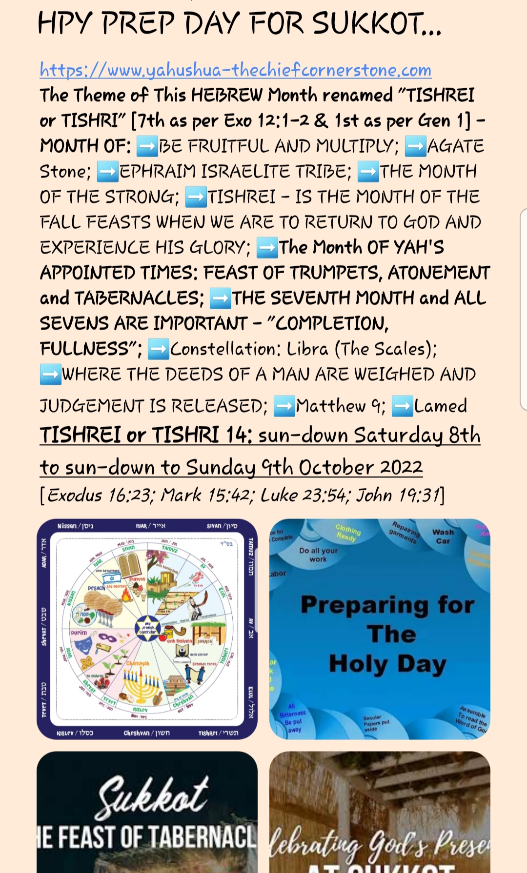 Year 2022: TISHREI or TISHRI 14: It’s PREPARATION DAY for SUKKOT/SUCCOTH HIGH SABBATHS [SHABBATOT HA GADOLOT] Day 1 & 2 [TISHREI 15 & 16]! – Exodus 16:23; Mark 15:42; Luke 23:54; John 19:31; Leviticus 23:33-43; Deuteronomy 12; 14; 16; John 7; Revelation 19; 22; etc…