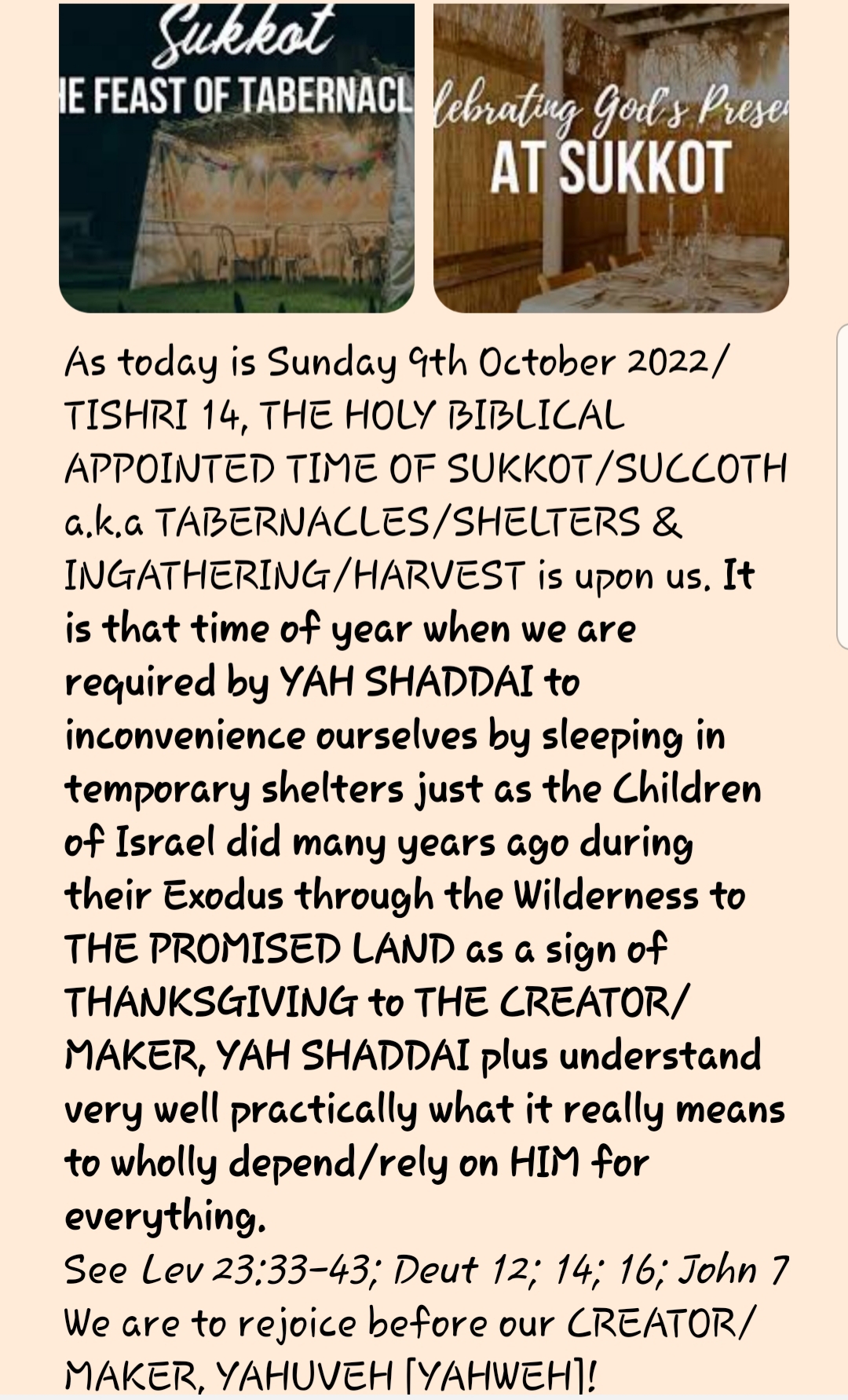 Today evening/at sun-down or sun-set, we enter into A NEW SEASON, ONE OF GREAT JOY as THE HOLY BIBLICAL APPOINTED TIME OF SUKKOT/SUCCOTH [TABERNACLES and IN-GATHERING] begins. This is the real and original time of our SAVIOUR’S [REDEEMER/DELIVERER/MASHIACH] BIRTH as well as a Taste of or Pre-celebration of THE MARRIAGE FEAST/SUPPER OF THE LAMB OF GOD, YAHUSHUA HA MASHIACH [a.k.a JESUS CHRIST]! HE was born on the first day of the FESTIVAL which is TISHRI 15 just as John [YAHUchanan] The Baptist/Immerser, his earthly cousin was born on the very first day of THE HOLY BIBLICAL APPOINTED TIME OF PASSOVER/PESACH – NISAN/AVIV/ABIB 14! There are 7 months between them which means that John The Baptist died roughly at the same age as YAHUSHUA HA MASHIACH died and resurrected. On the Roman Gregorian Calendar, the birth of JESUS CHRIST fell on 9th September. Therefore today, 9th October on the Roman Gregorian Calendar marks 1 month since the birthday anniversary. However on THE CREATOR/MAKER, YAH’S Calendar [HEBREW CALENDAR], the anniversary is at sun-down or sunset today until sunset tomorrow [Monday 10th October 2022]. HalleluYAH HalleluYAH HalleluYAH HalleluYAH HalleluYAH HalleluYAH HalleluYAH for this knowledge 👏👏👏