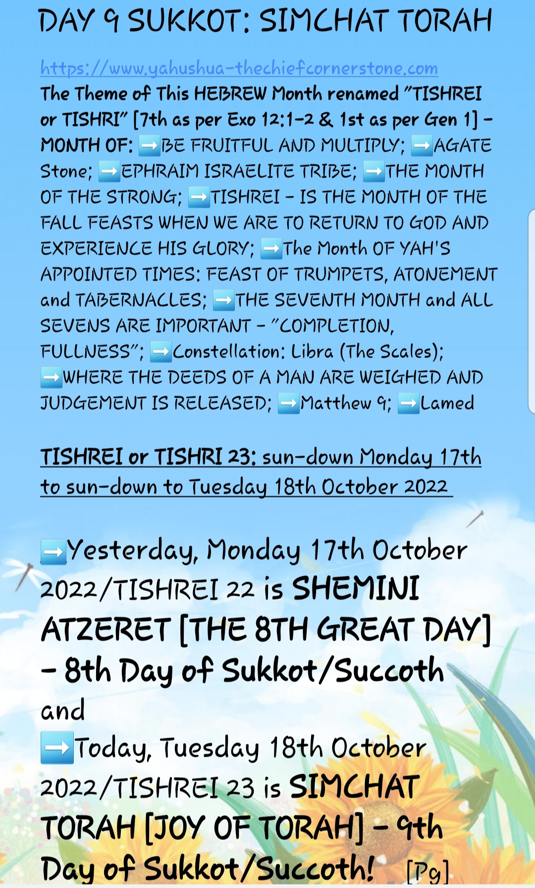 Tuesday 18th October 2022/Tishrei or Tishri 23 – Day 9 of SUKKOT/SUCCOTH,