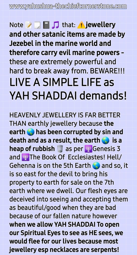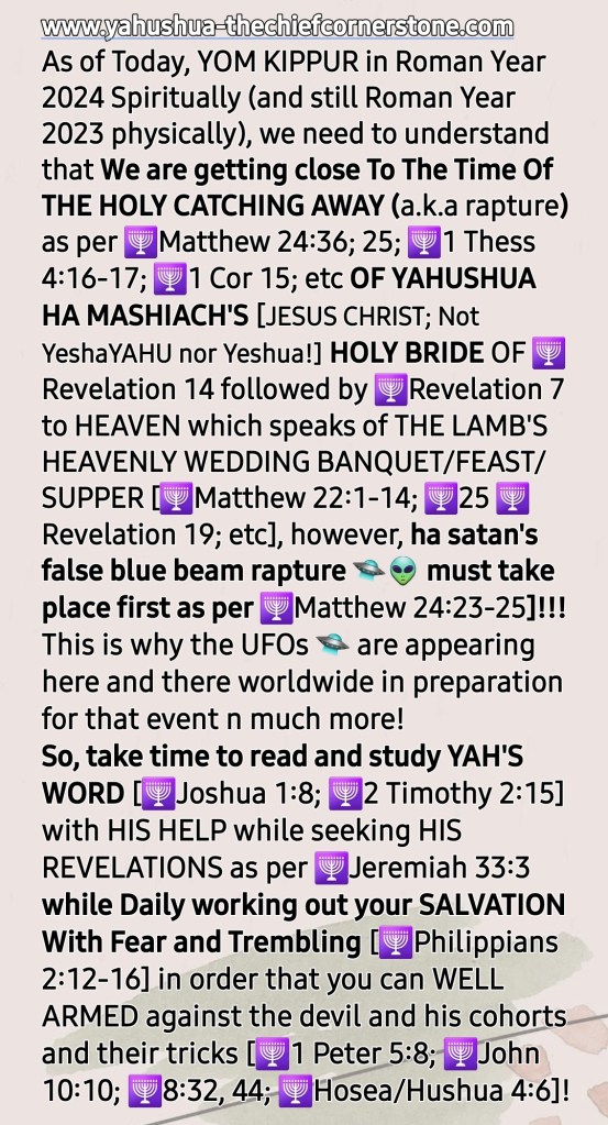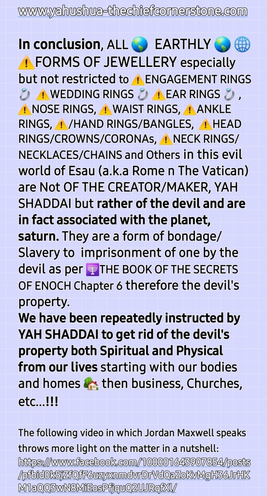 SHALOM! I am Brother Ade Israel and my wife is Sister Perpetua Shulamit. This is an online MESSIYAHNIC [MESSIANIC] HEBREW [a.k.a Jewish] PENTECOSTAL PROPHETIC MINISTRY with a HEALING/RESTORATION focus. See our TESTIMONY, VISION and MISSION STATEMENT Sections for more information on this. Welcome to our site [HOLY TEMPLE OF THE CREATOR, YAH SHADDAI without walls] created for PREACHING YAH'S GOSPEL [Matthew 28:18-20] and Sharing CRUCIAL END TIME TRUTHS [John 14:6; 8:32; Hosea 4:6]. *Please NOTE that we do not call ourselves nor anyone else who is a believer in and follower of THE ONE and ONLY TRUE MESSIAH [MASHIACH]/SAVIOUR/REDEEMER /DELIVERER who is popularly known worldwide as JESUS CHRIST [and Iesous, Jesu, Yesu, Yethu, etc] "Christian"* because we have learned through [HOLY] REVELATION from THE CREATOR/MAKER, YAH SHADDAI based on Malachai 1:1-5 and Romans 9:12-14 and Deuteronomy 12:29-32; Jeremiah 10; Ezekiel 8; etc that the terms, "Christian" and "Christianity" are Roman Vatican (Esau/Edom/Idumea) terms. *"Christian" (a tax bracket code person) actually or in fact means "A follower of the Anti-Messiah a.k.a Anti-Christ system* of Sin a.k.a Wickedness a.k.a TORAHlessness a.k.a LAWlessness System mention in 2 Thessalonians 2. *"Christianity" (a tax bracket code faith) a.k.a "Christian-Anity" is "the Vaticanisation of the Acts 2 Apostollic Foundation of Worshipping THE ONE TRUE GOD, YAH SHADDAI hence what is abominable to THE CREATOR/MAKER is widely acceptable in the name of 'the law has been done away with through nailing it to the cross', for example, Christianity encourages eating pig meat (pork, ham, bacon, etc) which is abomination as per Leviticus 11".* *Swine is a symbol of pig-mentation (skin colour) and demons love pig-mentation. Also, swine were worshiped as a deity in that location where YAHUSHUA HA MASHIACH [a.k.a JESUS CHRIST] cast the principality called "legion" out.* NOTE how the Romans introduced, established and emphasise "Easter ham" a.k.a Ishtar ham. they made it a tradition to eat pig meat 🐖 🐷 🐽 🐗 🐖 🐷 🐽 🐗 🐖 on the so-called Resurrection day of Jesus Christ, Why??? Pig meat is abomination to the LORD YAHUVEH and YAHUSHUA therefore pollutes YAH'S [GOD'S] TEMPLE (our bodies)! The Vatican is a den of demons and we are not of Rome/Esau!!!! Also, the term, "religion" = relagre = to bind back! Sadly, all roads lead back to Rome 🇮🇹 and The Vatican 🇻🇦. *Also, sadly, many of THE HOLY BIBLICAL SCRIPTURES have been Romanised and Vaticanised hence THE CREATOR/MAKER, YAH SHADDAI is calling us back to THE HEBREW ROOTS OF OUR FAITH IN HIM, HalleluYAH!* So, we call ourselves THE ORIGINAL TERM used before Roman and The Vatican changed/altered things which is: "MESSIYAHNIC [MESSIANIC] HEBREWS a.k.a JEWS"! We believe in plus followe in the footsteps of THE ONE and ONLY TRUE MESSIYAH [MESSIAH] as led by RUACH HA KODESH [HOLY SPIRIT; Not Ghost!!!] are in love with THE TORAH/LAW as per Joshua 1:8; Psalm 1; 119; Matthew 5:17-20; Colossians 2:16-17; etc. We believe in John 3:16; Romans 6:23; Isaiah 1:18-20 Matthew 28:18-20; etc as well as Acts 2; 8; etc: Genuinely Believe, Confess and Be Baptised by Immersion In Water followed➡️ by Immersion In RUACH HA KODESH then Daily Work Out Your SALVATION With Fear and Trembling [Philippians 2:12-16] while endeavouring To Be HOLY AS YAH Is HOLY [Leviticus; 1 Peter 1:16; Hebrews 12:14] and Bearing Many GOOD FRUIT FOR YAH SHADDAI [John 15; Galatians 5] !!! Once again, Welcome to our site [HOLY TEMPLE OF THE CREATOR, YAH SHADDAI without walls] created for PREACHING YAH'S GOSPEL [Matthew 28:18-20] and Sharing CRUCIAL END TIME TRUTHS [John 14:6; 8:32; Hosea 4:6]. ➡️This is our GETTR link [GETTR is the uncensored version of Twitter, just so you know] : https://gettr.com/user/yahushua7 ➡️We also have a *TELEGRAM Channel* [uncensored alternative to WhatsApp] and ➡️*MeWe* [uncensored alternative to Facebook and Instagram]! ➡️Here is our donation link if you please [if you wish to be a BLESSING to us and others in need worldwide through this online Ministry]: 📌https://www.paypal.me/AdeIsrael and/or 📌https://www.paypal.me/PNAMUTEBI ➡️Here is our donation page which explains what donations are for, if you please: https://yahushua-thechiefcornerstone.com/donations/ ➡️➡️➡️We are called and appointed by THE CREATOR, YAH SHADDAI to raise awareness of "THE JEWISH-NESS OF THE MESSIYAH [MESSIAH]" who is popularly known as JESUS CHRIST OF NAZARETH and how this affects THE BODY OF YAHUSHUA HA MASHIACH! ➡️➡️➡️THE HOLY TRINITY GODHEAD WHOM we worship are known as: 📌➡️1. GOD THE FATHER, ABBA YAHUVEH'S (a.k.a YAHWEH); 📌➡️2. GOD THE SON, YAHUSHUA [a.k.a YAHSHUA] HA MASHIACH and 📌➡️3. GOD THE MOTHER [IMMAYAH] a.k.a GOD THE HOLY SPIRIT (Not Ghost!) [RUACH HA KODESH] a.k.a SHEKINYAH GLORY [Isaiah 60:1-2; etc] a.k.a WISDOM [Proverbs 8:22-31]! Please NOTE that 2 Corinthians 13:14 is evidence of the existence of THE HOLY TRINITY GODHEAD [YAHUVEH – FATHER; YAHUSHUA HA MASHIACH – SON; IMMAYAH a.k.a SHEKINYAH GLORY – MOTHER] just as Revelation 16:13 read alongside Revelation 13 is the evidence of the existence of ⚠️the Unholy Trinity godhead (lucifer – father, Barrack Hussein Obama – son and Pope Francis a.k.a Jorge Mario Bergoglio – mother)!⚠️ There is a crucial and urgent need for increased ACKNOWLEDGEMENT/RECOGNITION and AWARENESS of the MESSIYAH [MESSIAH] JESUS CHRIST'S [Not Yeshua! ; Not YeshaYAHU!!!] HEBREW-NESS or JEWISHNESS plus how it affects us, mankind who desire to dwell with HIM for eternity. *The Left Behind during and after THE FIRST HOLY CATCHING AWAY (Not "RAPTURE" which means rape) TO THE HEAVENS will be the most affected by this issue of THE NAME OF THE MESSIAH!* It will begin to take effect during The Upcoming 3 Days and Nights of Worldwide Gross Darkness [Amos 8:9-10; Joel 2:30-32; Matthew 12:38-42; Mark 8:12; etc]. See how people gen