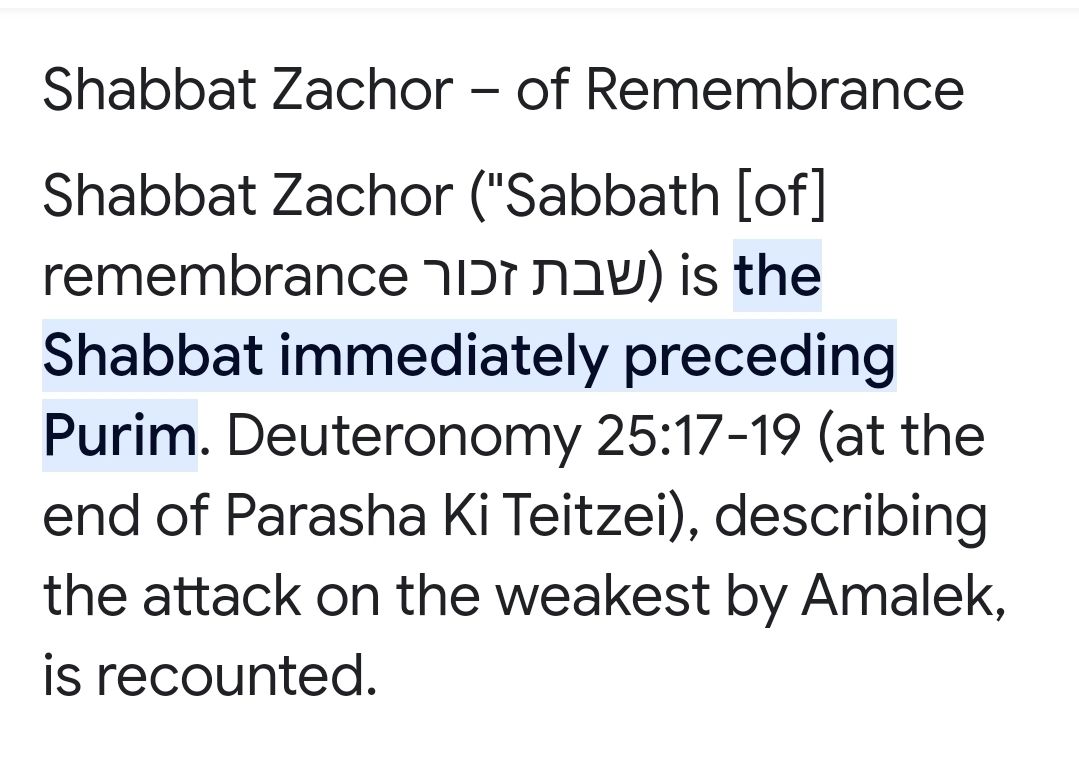 Shabbat Zachor (“Sabbath [of] remembrance שבת זכור) is the Shabbat immediately preceding Purim. Deuteronomy 25:17-19 (at the end of Parasha Ki Teitzei), describing the attack on the weakest by Amalek, is recounted.