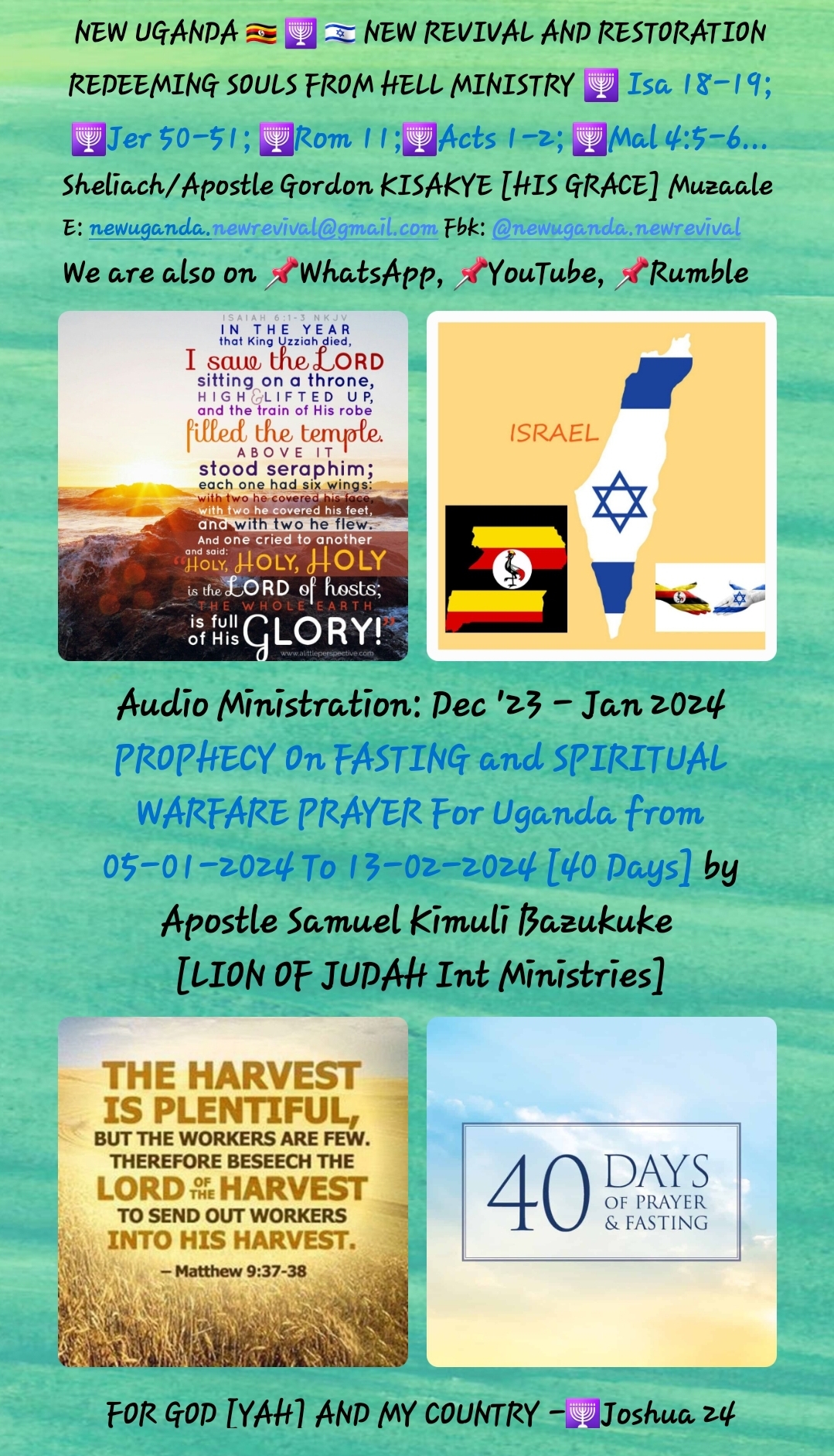 Audio Ministration in Luganda Language mostly: December 2023 – January 2024 PROPHECY FASTING SPIRITUAL WARFARE PRAYER For Uganda🇺🇬🕎🇮🇱 DATES: 05-01-2024 To 13-02-2024