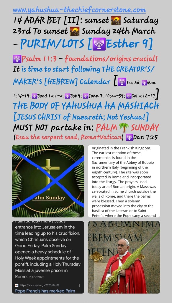 N/B: On the Roman Gregorian Calendar [🕎Daniel 7:25], PURIM/LOTS was replaced with/by Shrove Tuesday a.k.a Pancake Tuesday followed by a demonic/satanic fasting period called “Lent (40 days)” which is all about the sun god and sun god reborn namely, tammuz [🕎Ezekiel 8]. *Lent and this week of pagan/heathen “Maundy Thursday”, “Good Friday” and “Easter/Ishtar” have nothing to do with JESUS CHRIST of Nazareth [YAHUSHUA HA MASHIACH] as shared previously (some weeks back)!!!*