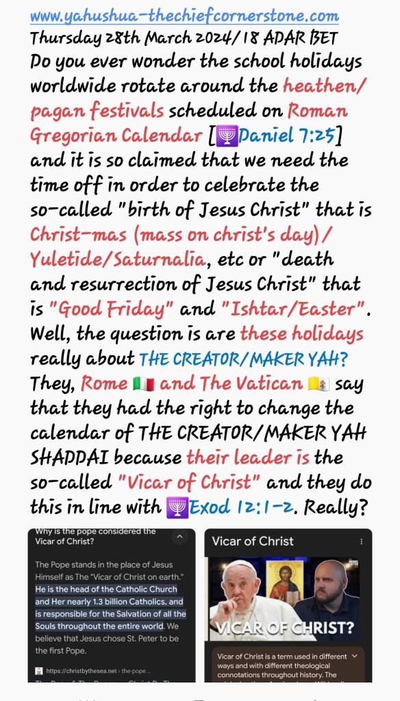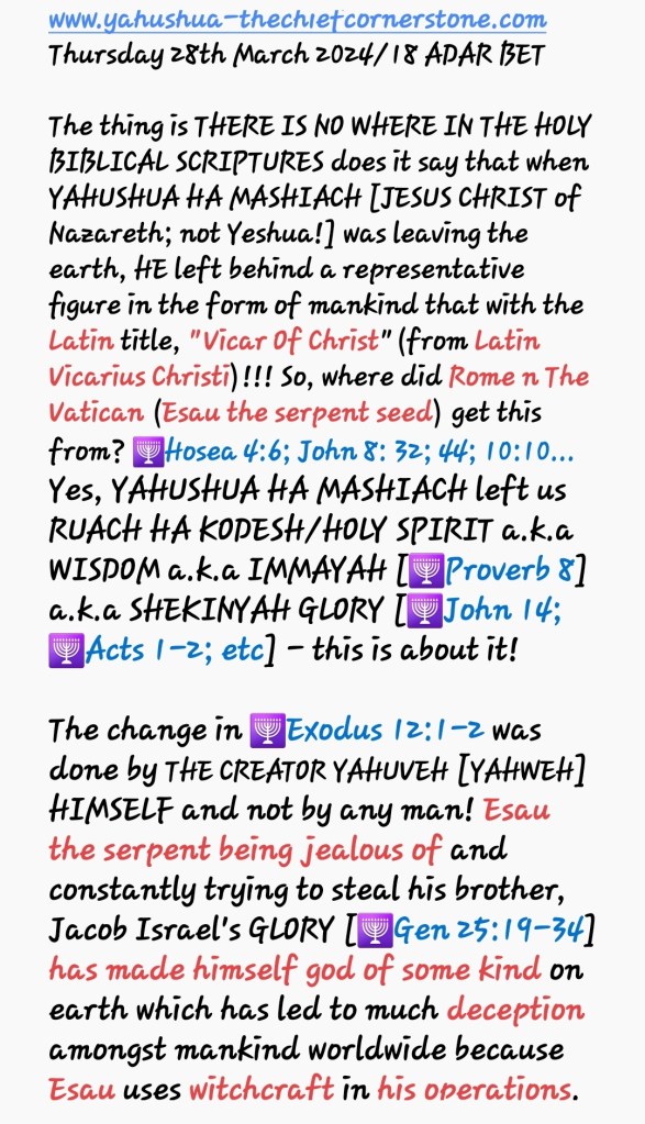 As I have repeatedly shared, these spots and wrinkles are representative of sin/evil/wickedness/TORAHlessness/LAWlessness which comes in different forms. One way in which to sin against YAH SHADDAI is by observing the pagan/heathen holidays all of which were instituted by Rome and The Vatican 🇮🇹 🇻🇦 and therefore the result of holding onto these days as special days while still claiming to be A TRUE CHILD OF YAH SHADDAI having accepted YAH’S SALVATION [YAHUSHUA] makes one to get stained SPIRITUALLY. The stains lead to one not being fit to be caught up in the air with YAHUSHUA HA MASHIACH as per fulfilment of 1 Thessalonians 4:16-18. THE LORD YAH ALMIGHTY Says Prophetically that all those who contimue to hold onto Sunday as their Weekly Sabbath and all the pagan/heathen holidays including Christmas, Valentine’s Day, Shrove/Pancake Tuesday, Ash Wednesday, Lent, Maundy Thursday, Good Friday, Easter/Isthar Saturday Sunday and Monday, Pentecost Sunday as well as many others are not considered to be YAHUSHUA HA MASHIACH’S BRIDE and will not be Raptured/Caught Up In The Air With HIM!!! They are counted among THE TEN WISE VIRGINS of 🕎Matthew 25:1-13. Rather, they remain YAHUSHUA HA MASHIACH’S GUESTS and therefore amongst the Left Behind.