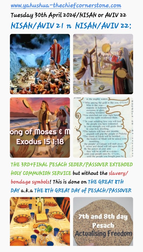 While NISAN/AVIV 21 is a GREAT 7TH DAY which marks THE Sea of Reeds a.k.a Red Sea Crossing, NISAN/AVIV 22 is THE GREAT 8TH DAY a.k.a THE 8TH GREAT which marks NEW BEGINNINGS OF FREEDOM IN YAH SHADDAI having been DELIVERED from Pharoah, bondage/slavery and Egypt/Mitzrayim and now facing what lies ahead with THE LORD YAHUSHUA HA MASHIACH!