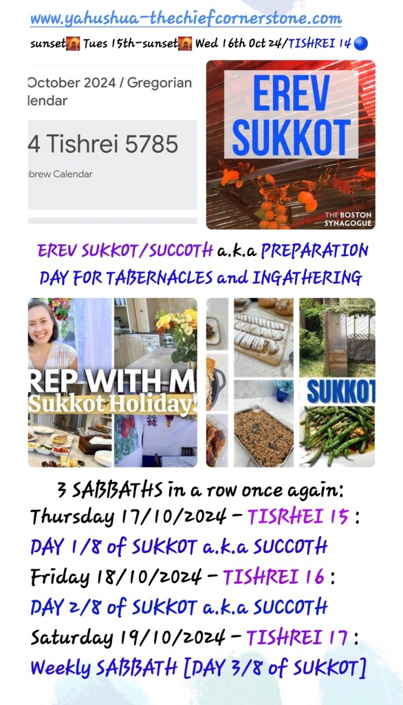SHALOM ALEICHEM Brethren in YAHUSHUA HA MASHIACH [JESUS CHRIST of Nazareth; Not Yeshua!], 3 SABBATHS in a row coming up… Thursday 17-10-2024/TISHREI 15 [DAY 1/8 of SUKKOT] ; Friday 18-10-2024/TISHREI 16 [DAY 2/8 of SUKKOT] ; Saturday 19-10-2024/TISHREI 17 [Weekly SABBATH and DAY 3/8 of SUKKOT], HalleluYAH! We eat, fellowship, sleep, etc in the SUKKAH for 8 days, How exciting! It’s a great opportunity to invite guests over… There are more instructions in 🕎Leviticus 23:33-43! We also see SUKKOT in THE NEW COVENANT/TESTAMENT [HA BRIT CHADASHA]. These 8 days have similarities with 8 DAY CHANUKAH a.k.a HANNUKAH/ DEDICATION and LIGHTS as well as 8 DAY PESACH/PASSOVER, HalleluYAH! We eat and dance to our Fill within reason! We also pray, worship YAH SHADDAI in song plus read and study HIS WORD daily. Remember that 🕎 GOD THE FATHER, YAHUVEH [YAHWEH] 🕎 walks across the earth 🌎 🌍 🌏 🗺 🌏 🌐 yearly this time of SUKKOT and communes with those who are celebrating HIS Only Begotten SON, YAHUSHUA HA MASHIACH’S BIRTHDAY! HE will make HIMSELF visible to you if you seek HIM diligently and faithfully. If you can’t afford to have a SUKKAH outside, then try to create something similar inside your home.
