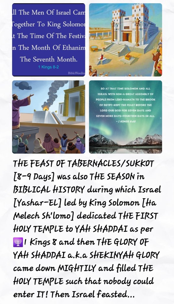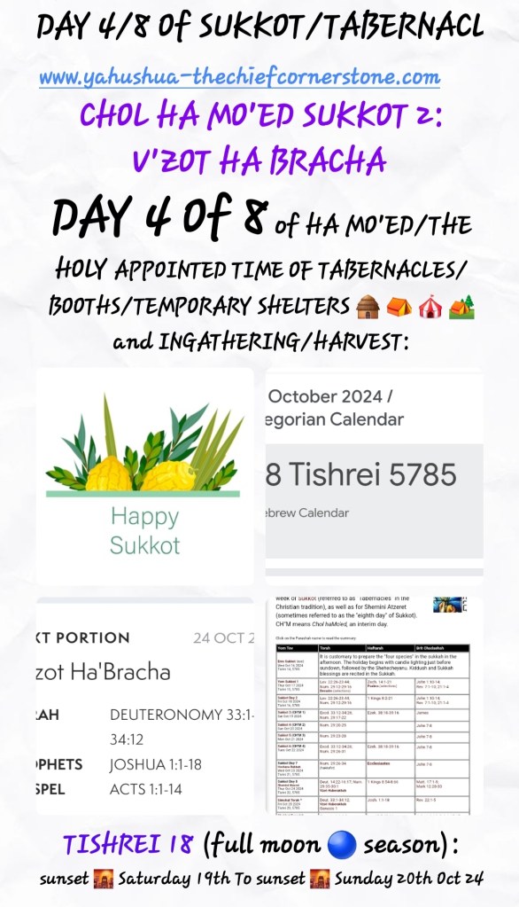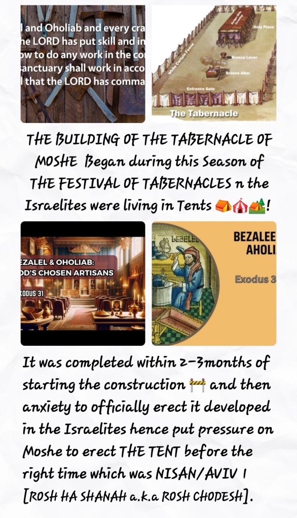 SUKKOT/TABERNACLES is also about us, mankind’s bodies as THE TABERNACLE and TEMPLE of YAH SHADDAI! And it is interesting that after THE 7TH DAY: HOSHANAH RABBAH comes THE GREAT 8TH DAY a.k.a THE 8TH GREAT DAY and then SIMCHAT TORAH [9TH DAY]! We celebrate receiving of THE SECOND SET OF TORAH TABLES which were handed over to Moshe in HEAVEN on YOM KIPPUR/DAY OF ATONEMENT, the 40th Day of having climbed Mount Sinai to seek forgiveness for the Golden Calf Sin, however, the children did not receive THE TORAH TABLES until SIMCHAT TORAH! Nevertheless, by this time, Moshe had been reading it out to them and giving instructions for The Construction 🚧 OF THE TABERNACLE/TENT OF MEETING plus collecting donations towards the construction 🚧 of THE TENT!
