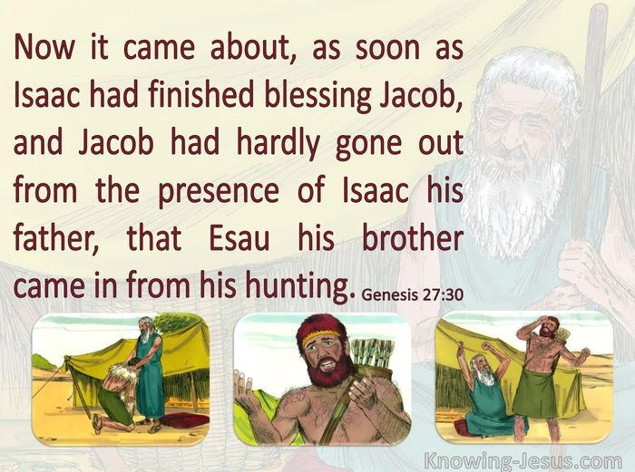 Esau marries two Hittite women. Isaac grows old and blind, and expresses his desire to bless Esau before he dies. While Esau goes off to hunt for his father’s favorite food, Rebecca dresses Jacob in Esau’s clothes, covers his arms and neck with goatskins to simulate the feel of his hairier brother, prepares a similar dish, and sends Jacob to his father. Jacob receives his father’s blessings for “the dew of the heaven and the fat of the land” and mastery over his brother. When Esau returns and the deception is revealed, all Isaac can do for his weeping son is to predict that he will live by his sword, and that when Jacob falters, the younger brother will forfeit his supremacy over the elder.