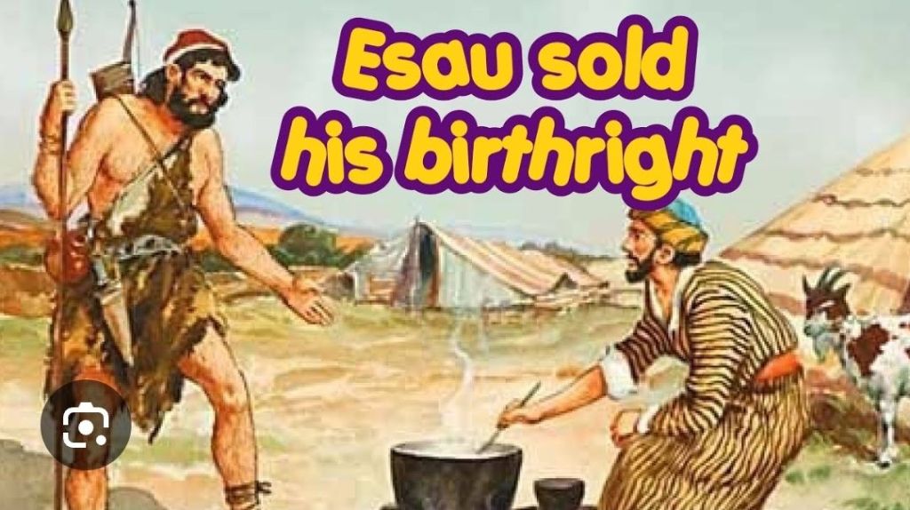 Esau emerges first; Jacob is born clutching Esau’s heel. Esau grows up to be “a cunning hunter, a man of the field”; Jacob is “a wholesome man,” a dweller in the tents of learning. Isaac favors Esau; Rebecca loves Jacob. Returning exhausted and hungry from the hunt one day, Esau sells his birthright (his rights as the firstborn) to Jacob for a pot of red lentil stew.