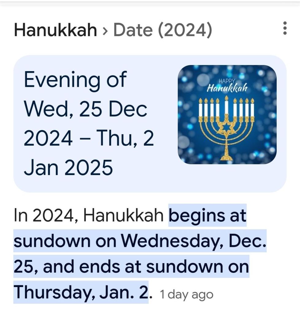 SHABBAT SHALOM Brethren in YAHUSHUA HA MASHIACH [JESUS CHRIST of Nazareth; Not Yeshua!], after celebrating SHABBAT today, we go into ROSH CHODESH 🌙 🌃 🌉 🌌 Celebrations, HalleluYAH HalleluYAH HalleluYAH! Then, we start to read THE FIRST BOOK OF MACCABEES, THE SECOND BOOK OF MACCABEES, THE THIRD BOOK OF MACCABEES and THE FOURTH BOOK OF MACCABEES in preparation for CHANUKAH a.k.a HANNUKAH/DEDICATION and LIGHTS which commences at sunset 🌇 on Wednesday 25th December 2024 and ends on sunset 🌇 Thursday 2nd January 2025!