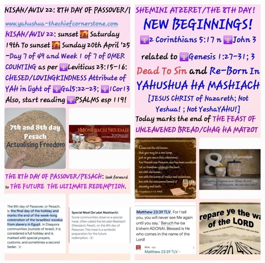 Please NOTE that tomorrow The 8TH DAY [SHEMINI ATZERET] of the Festival of UNLEAVENED BREAD [NISAN/AVIV 22: sunset 🌇 Saturday 19th To sunset 🌇 Sunday 20th April 2025], the day on which we do one more PASSOVER SEDER/EXTENDED HOLY COMMUNION SERVICE but this time with no bitterness or hardship symbols [symbolic foods]. Rather, we share SWEETNESS FOODS instead as a precursor to and foreshadow of THE COMING HOLY/SANCTIFIED WORLD OF ISRAEL [YASHAR-EL] – THE MILLENNIAL SABBATH REIGN of YAHUSHUA HA MASHIACH on earth.