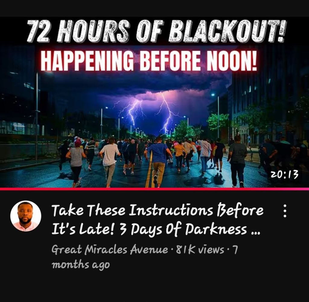 Please prepare well for THE Upcoming PHYSICAL 3 DAYS OF DARKNESS DAYS keeping in mind that life will not go back to normal as such at the end of the Darkness. Also, Prepare for THE HOLY RAPTURE TO HEAVEN Event if you are among THE RAPTURABLE and if not, prepare for how to survive or get through THE COMING GREATEST TRIBULATION PERIOD!