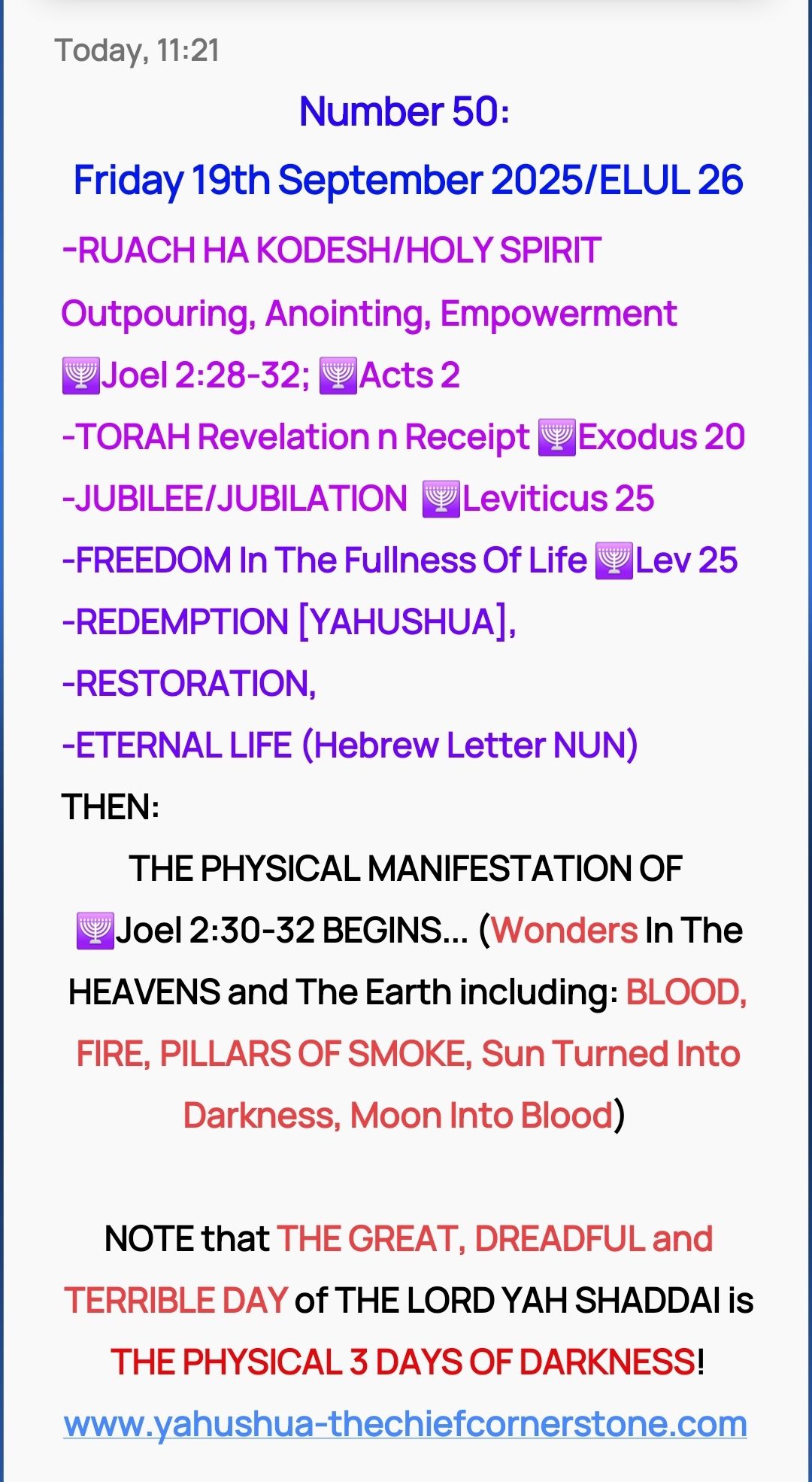 D0 NOT make plans to meet at Church this coming Saturday 20th September 2025/ELUL 27 and Sunday but more so, Sunday 21st September 2025/ELUL 28 because of THE COMING PHYSICAL 3 DAYS OF DARKNESS!!!⬅️⬅️⬅️⬅️