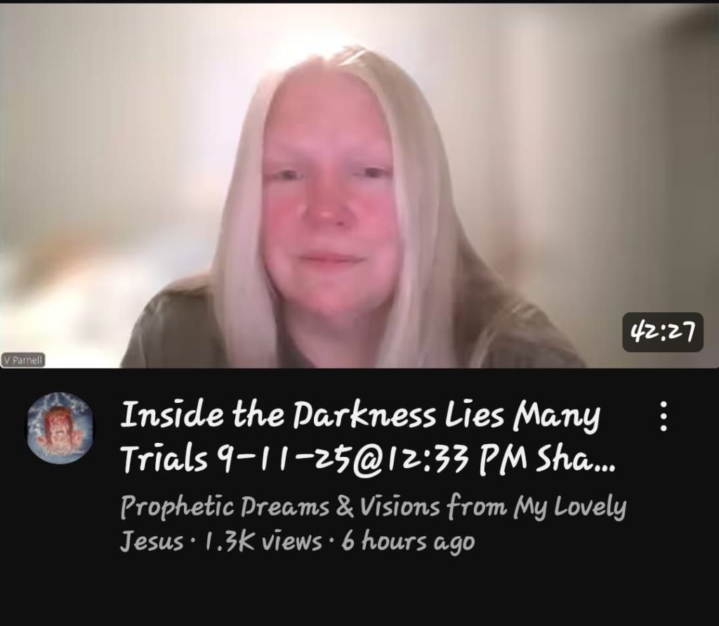Video 📹 🎥: Inside The Darkness Lies Many Trials 9-11-25 @12.33pm Shared 9-20-25 (Note: American way of writing dates) by Sister Vicki Goforth Parnell @My Lovely JESUS Ministry https://youtu.be/s17cQqr8M68?si=8zGR8Ofp-BmkTv4j