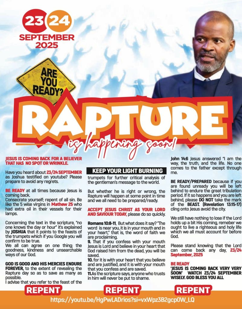 Brother Joshua Mhlakela, Sister Hlengiwe Mchunu and Brother Sizwe Graced and many more should not lose FAITH in THE LORD YAH SHADDAI and their Prophecy because of this because THE LORD YAH SHADDAI will do what HE will do for a reason. It will happen at a time when we all least expect it…very soon from today, Monday 22nd September 2025/ELUL 28!