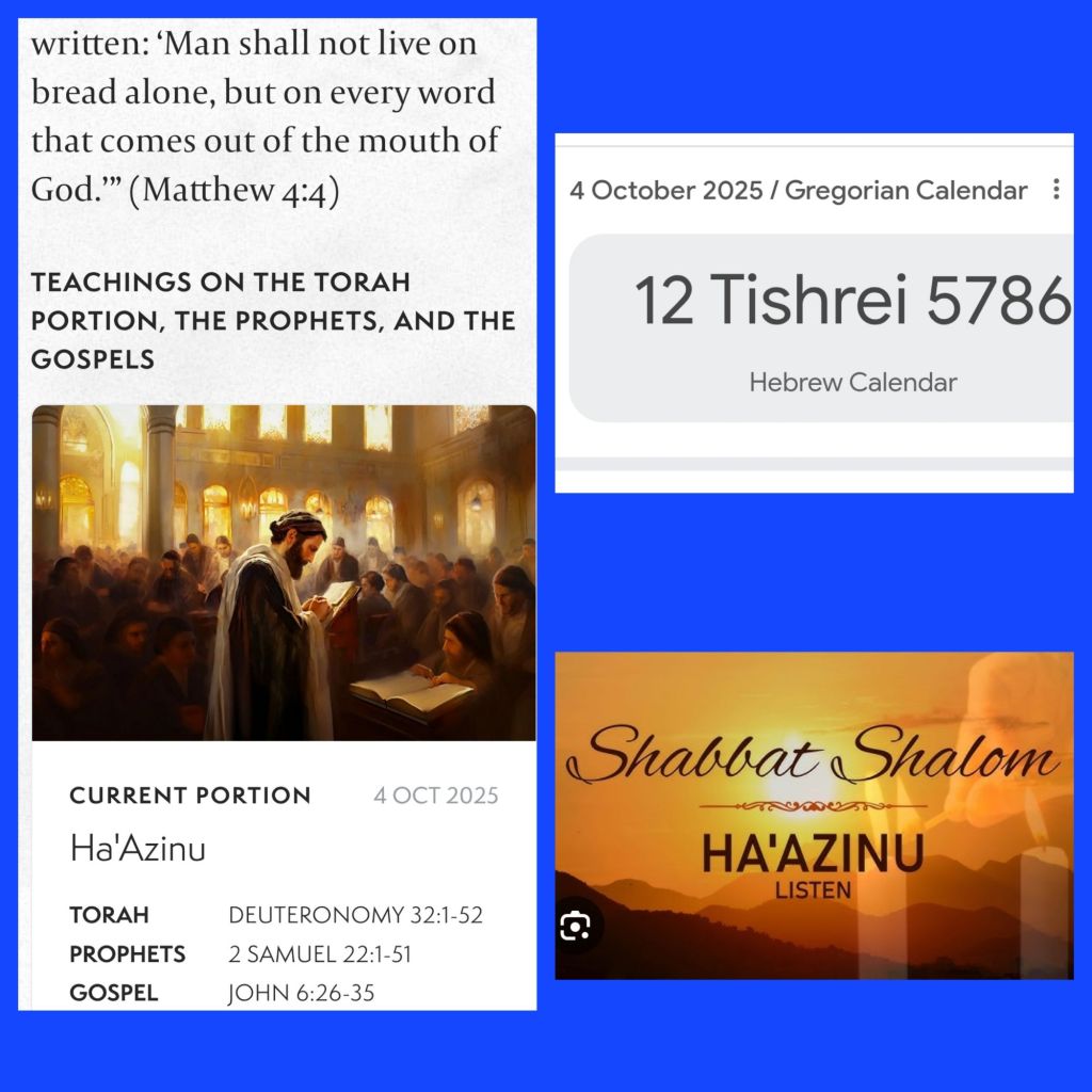 SHABBAT HA’AZINU/LISTEN SHALOM on sunset 🌇 Friday 3rd To sunset 🌇 Saturday 4th October 2025/TISHREI 12… 🕎Deuteronomy 32:1-52; 🕎2 Samuel 22:1-51; 🕎John 6:26-35