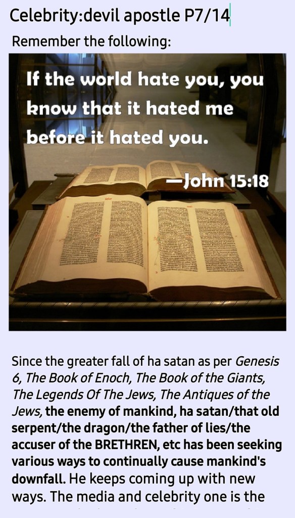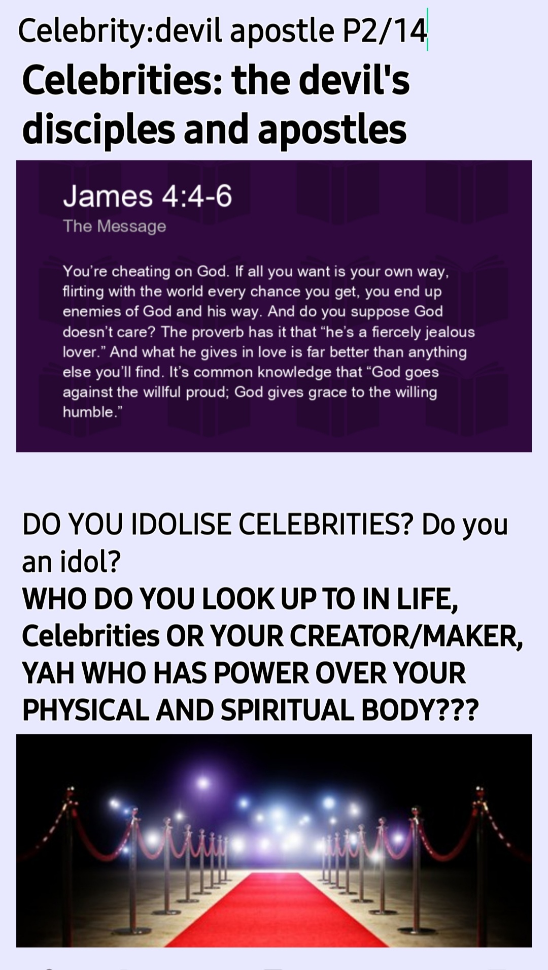 Celebrites are extremely ugly in the Spiritual Realm so do not be mesmerised by their fake physical beauty!!! They resemble their evil master! All Celebrities do is to promote and expand the kingdom of darkness on earth 🌎! *They are one with Esau (Rome) and Ishmael (Islam with Turkey being a major focal point). BEWARE!!! Come out of their spider Web before it is too late.* Listening to their music; admiring and emulating them, watching their movies, soaps, etc; all cause your soul to be drawn closer to and deeper into hell fire 🔥! STOP ADMIRING THEIR DRESSCODE AND WEALTHY LIFESTYLE!!! They are all blood stained. They have nothing good to offer anyone just like we see in Genesis 3. *WHATEVER YOU FEED ON, not just in terms of food but in all areas of life affects you Spiritually and Physically! It actually manifests in the Spiritual Realm and it is clear as glass visible to everyone who can see into the Spiritual Realm!* So, close all the gates to the enemy. Rebuke evil thoughts. Stop meditating on and Memorising worldly song and seeking to know about celebrities. They know where they are going so they are doing their very best to enjoy here because their next home is full of eternal torment for they sold their souls to the devil. *REPENT by Throwing away all the devil’s property including worldly music, movies, etc and then be Cleansed by YAHUSHUA HA MASHIACH’S BLOOD then get off rhe Broad way to hell fire and join THE NARROW WAY TO HEAVEN!!!* Joshua 1:18; Psalm 1 – Rather Meditate on and Memorise THE CREATOR, YAH’S WORD!