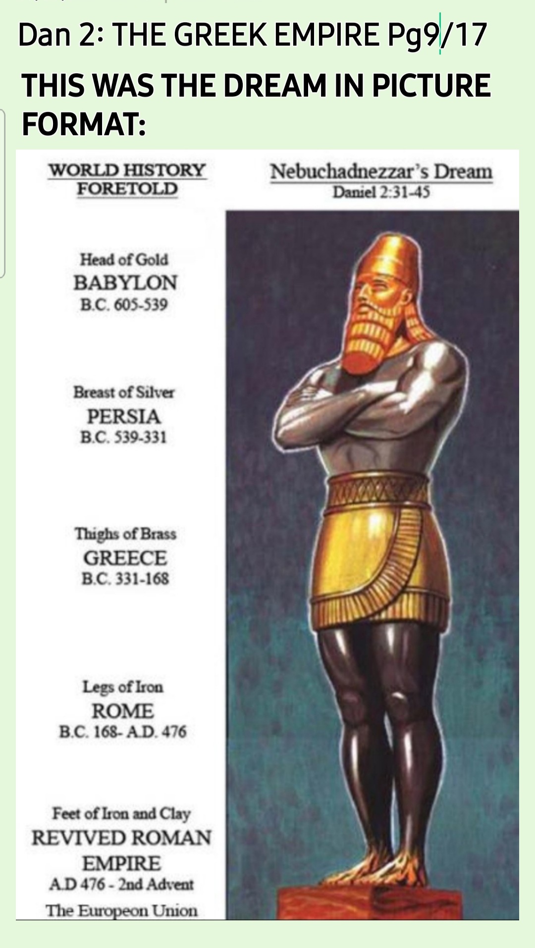 *What most people DON’T UNDERSTAND is that there is ONE PART of the NEBUCHADNEZZAR STATUE that was FULFILLED in BIBLICAL PROPHECY however THE ENGLISH BIBLE WRITERS deliberately omitted it when putting THE HOLY BIBLE together so that CHRISTIANS do not get an incline as to what to expect during THE GREAT TRIBULATION particularly with regards to the Abomination of Desolation, etc!* The information that was omitted until EXTREMELY VITAL FOR EVERYBODY TO KNOW as it will affect us all somehow….! This event occurred sometime before YAHUSHUA HA MASHIACH’S [a.k.a JESUS CHRIST; not Yeshua!] FIRST COMING To earth ! IT IS THEREFORE SUPPOSED TO COME AFTER THE BOOK OF MALACHAI!