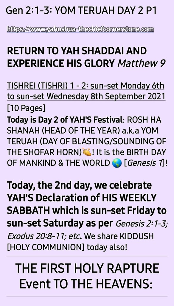 *Today, Wednesday 8th September 2021 is Day 2 of THE CREATOR, YAH’S BIBLICAL FESTIVAL called ROSH HA SHANAH a.k.a YOM TERUAH [Leviticus 23-25; Genesis 1:26-31].*