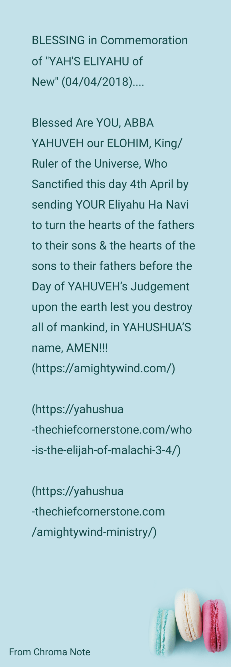 Blessed Are YOU, ABBA YAHUVEH our ELOHIM, King/Ruler of the Universe, Who Sanctified this day 4th April by sending YOUR Eliyahu Ha Navi to turn the hearts of the fathers to their sons and the hearts of the sons to their fathers before the Day of YAHUVEH’s Judgement upon the earth lest you destroy all of mankind, in YAHUSHUA’S name, AMEN!!!