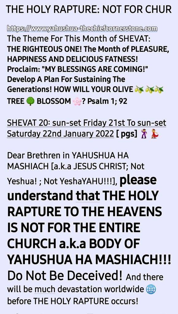 Dear Brethren in YAHUSHUA HA MASHIACH [a.k.a JESUS CHRIST; Not Yeshua! ; Not YeshaYAHU!!!], please understand that THE HOLY RAPTURE TO THE HEAVENS IS NOT FOR THE ENTIRE CHURCH a.k.a BODY OF YAHUSHUA HA MASHIACH!!! Do Not Be Deceived! And there will be much devastation worldwide 🌐 before THE HOLY RAPTURE occurs!