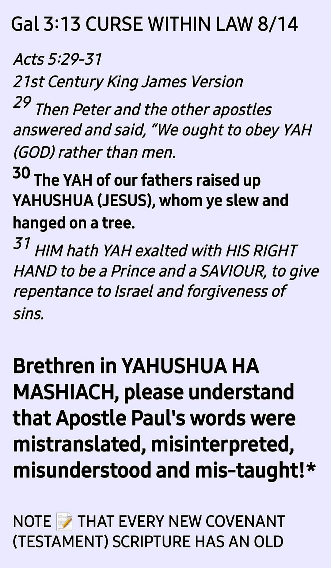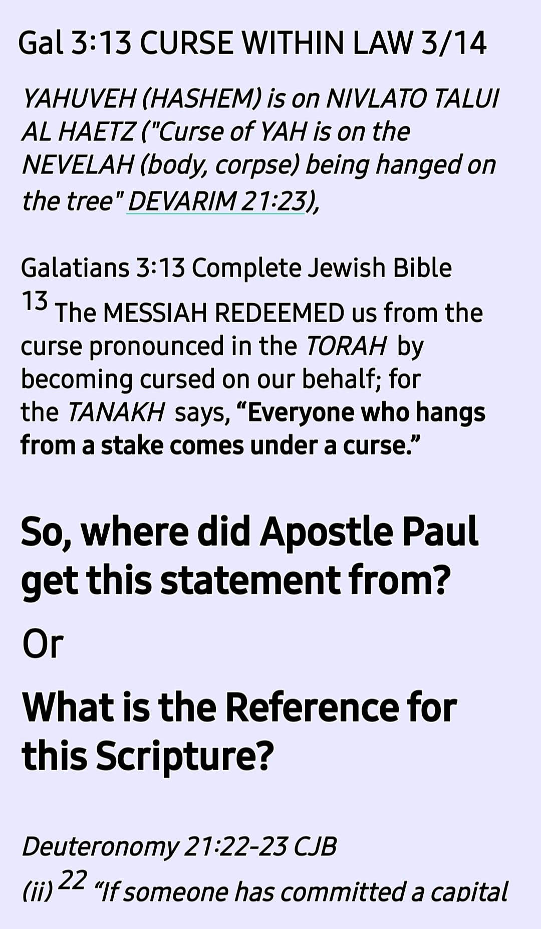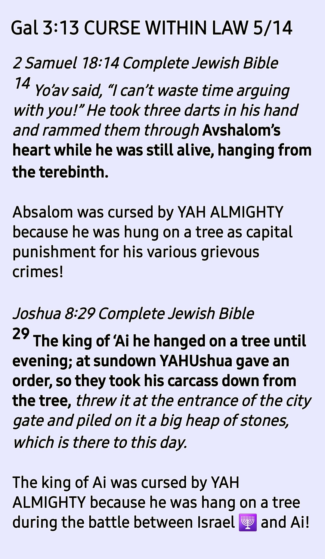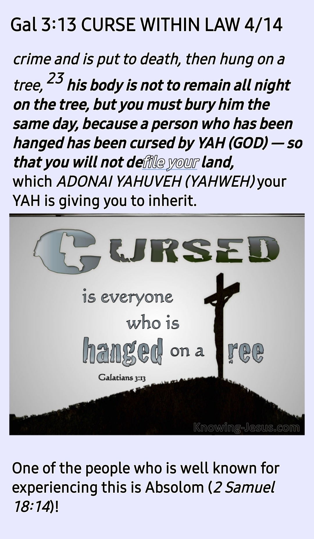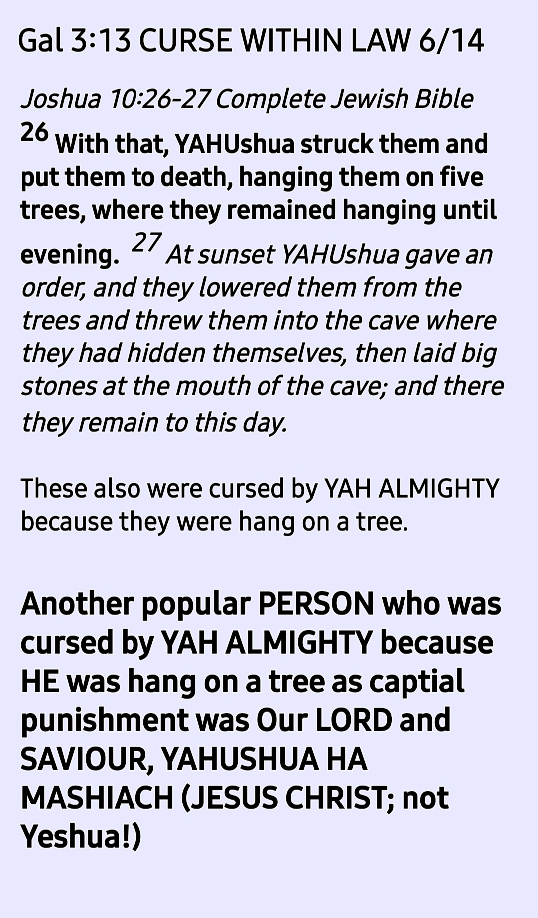 As we commence the reading and studying of the Book of Deuteronomy this week (ending Saturday 17th July 2021), let us read it with the right understanding of Galatians 3:13 Ref to Deuteronomy 21:23l because it was this very Book that Yahushua (Joshua) the Son of Nun was reading when YAH appeared to Yahushua the son of Nun and told him the words written in Joshua 1:6-9!