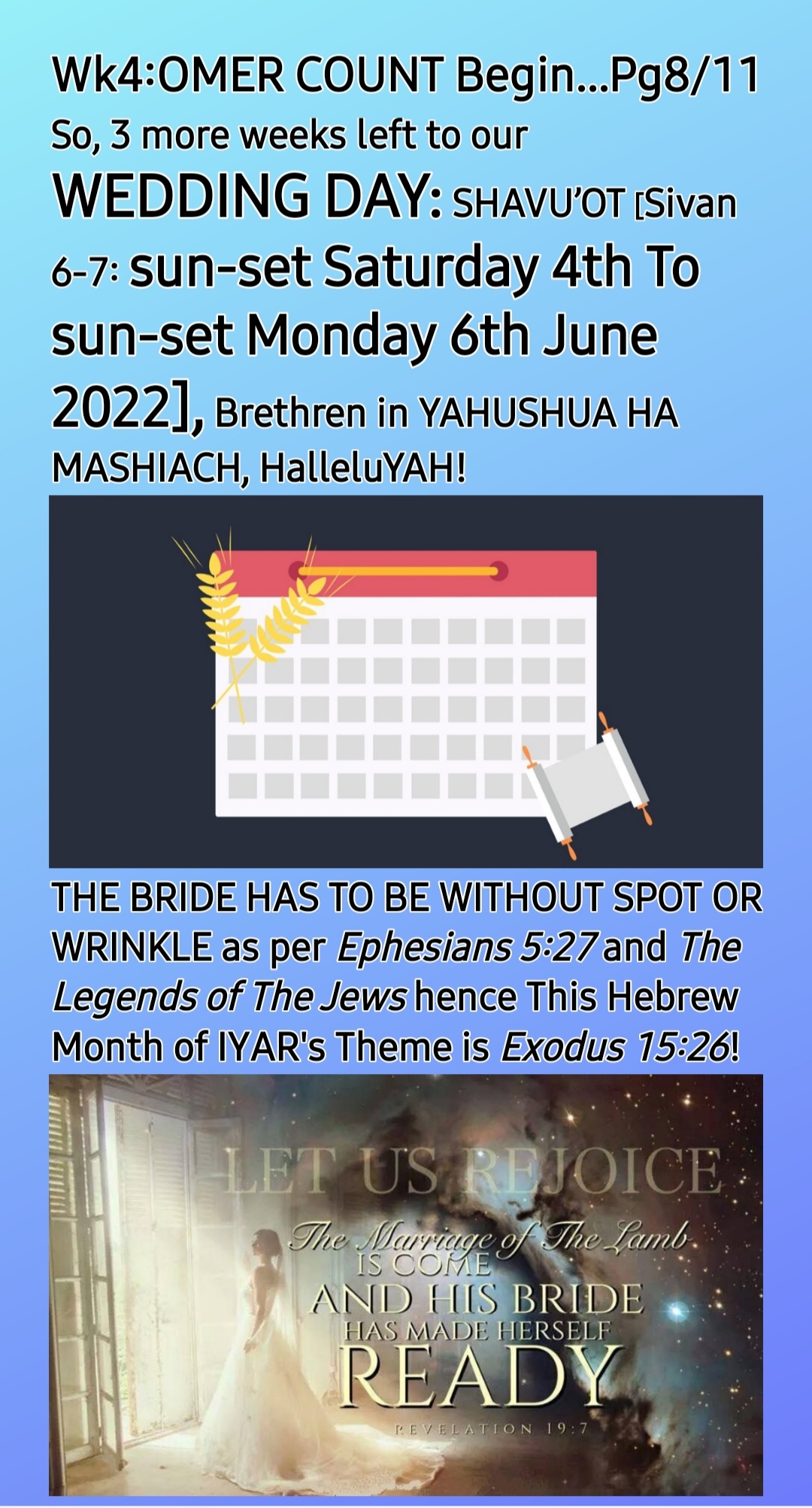 So, THE WEDDING took place on SHAVU’OT [WEEKS] PENTECOST and THE WEDDING FEAST/SUPPER is to take place on SUKKOT/SUCCOTH a.k.a TABERNACLES AND IN-GATHERING/HARVEST! *In order to attend THE WEDDING FEAST OF THE LAMB as HIS BRIDE currently on earth, you have to experience THE HOLY RAPTURE or to be RAPTURED TO THE HEAVENS! Everybody else attends by experiencing Earthly death.* YAHUSHUA HA MASHIACH’S BRIDE who are currently on earth in various countries worldwide 🌐 numbered as 288,000 [144,000 from Revelation 14 + 144,000 from Revelation 7] *ARE NOT destined to experience Earthly death!!!* The GUESTS on the earth right now are also numbered. Most (not all) of these will enter into ETERNAL LIFE through death!