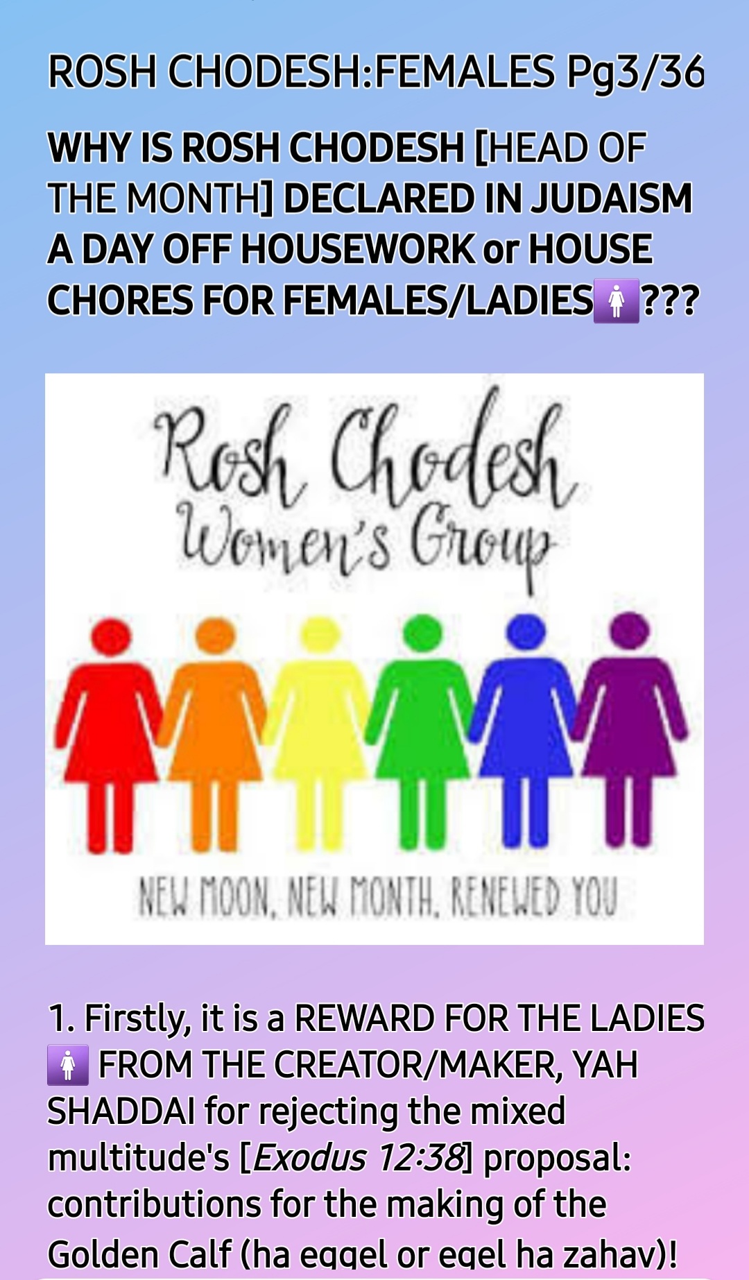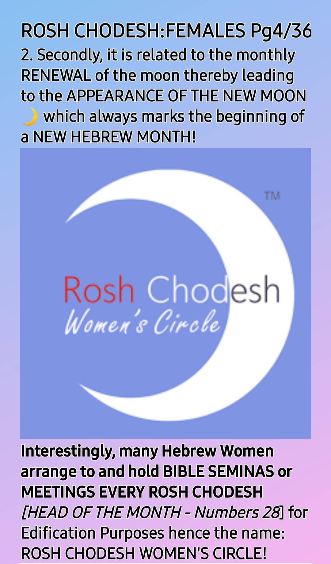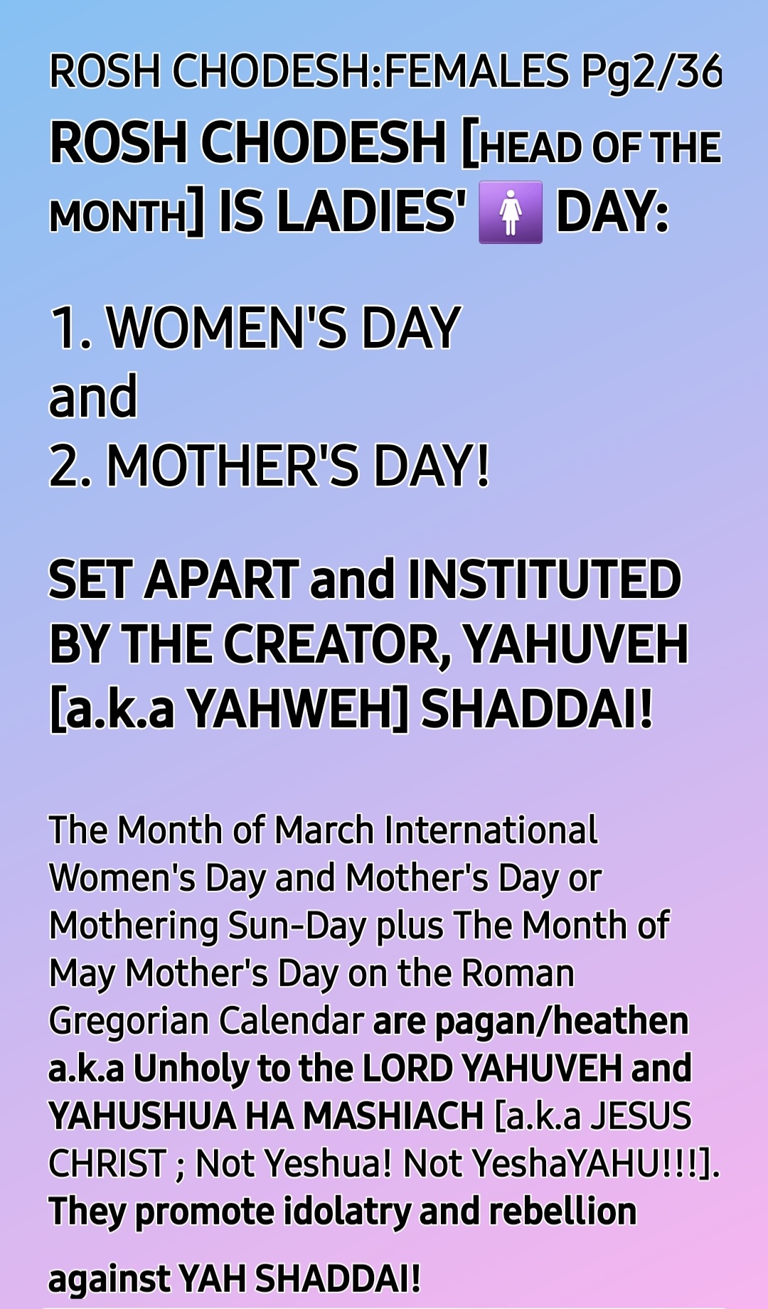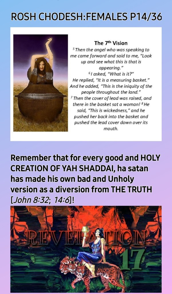 So, ROSH CHODESH [HEAD OF THE MONTH] IS BOTH WOMEN’S DAY AND MOTHERS’ DAY, the only HOLY One Instituted by THE CREATOR, YAH SHADDAI!