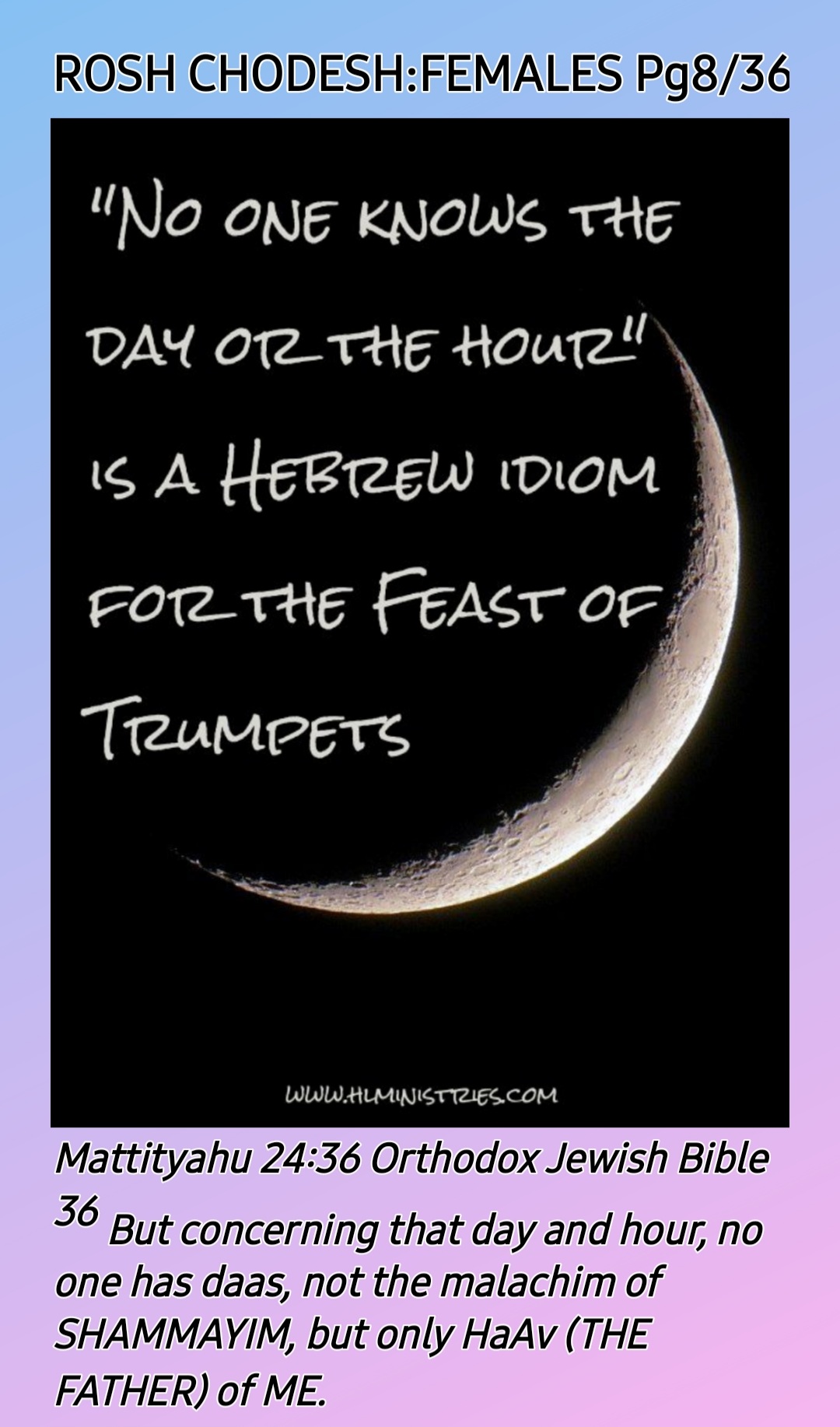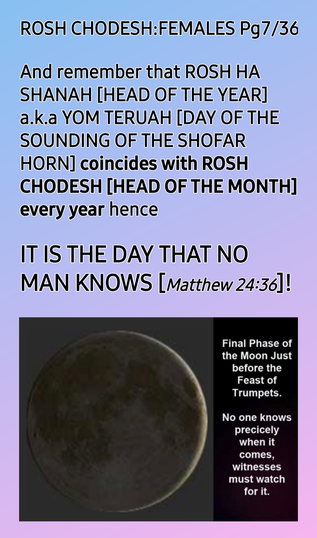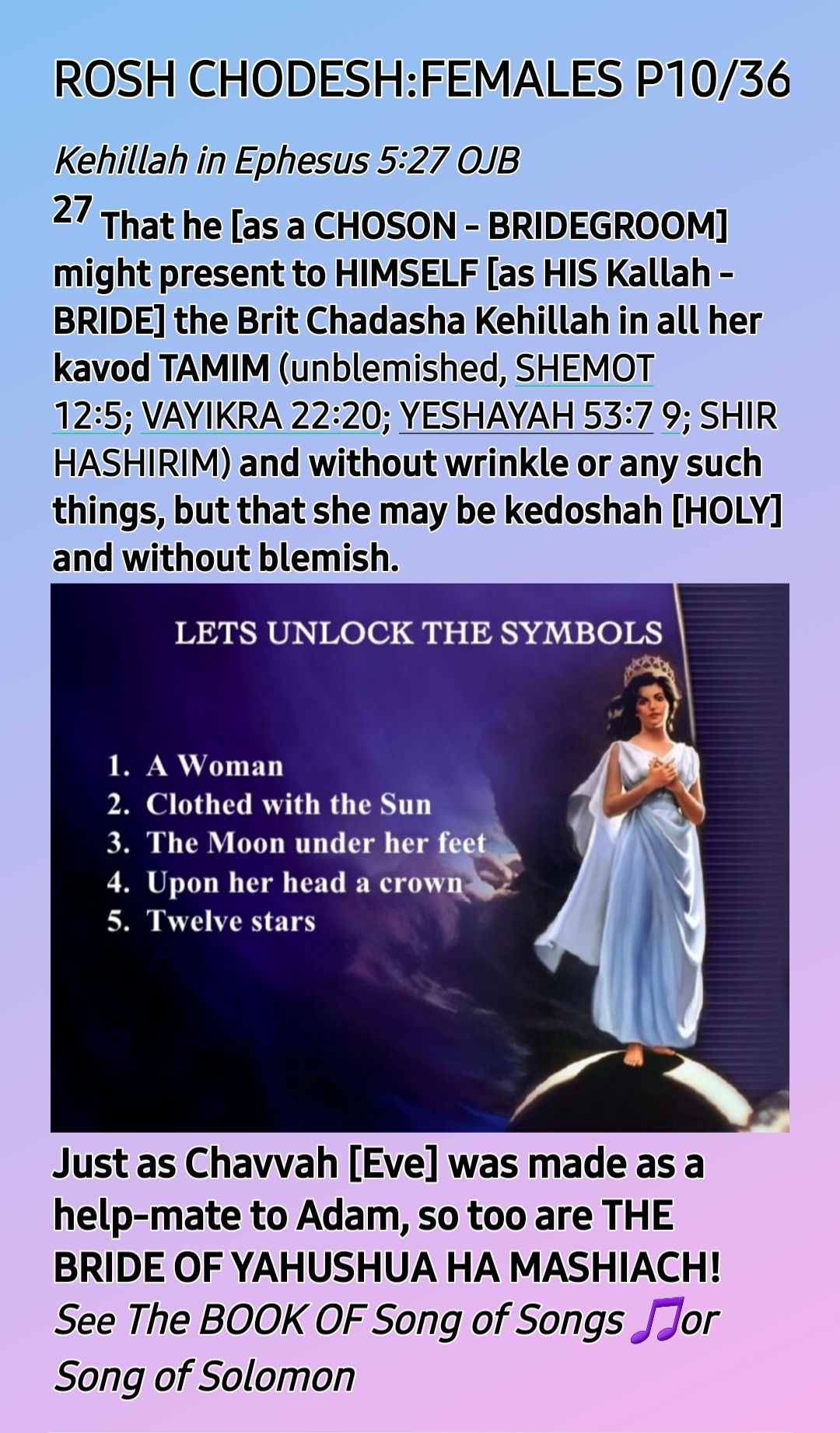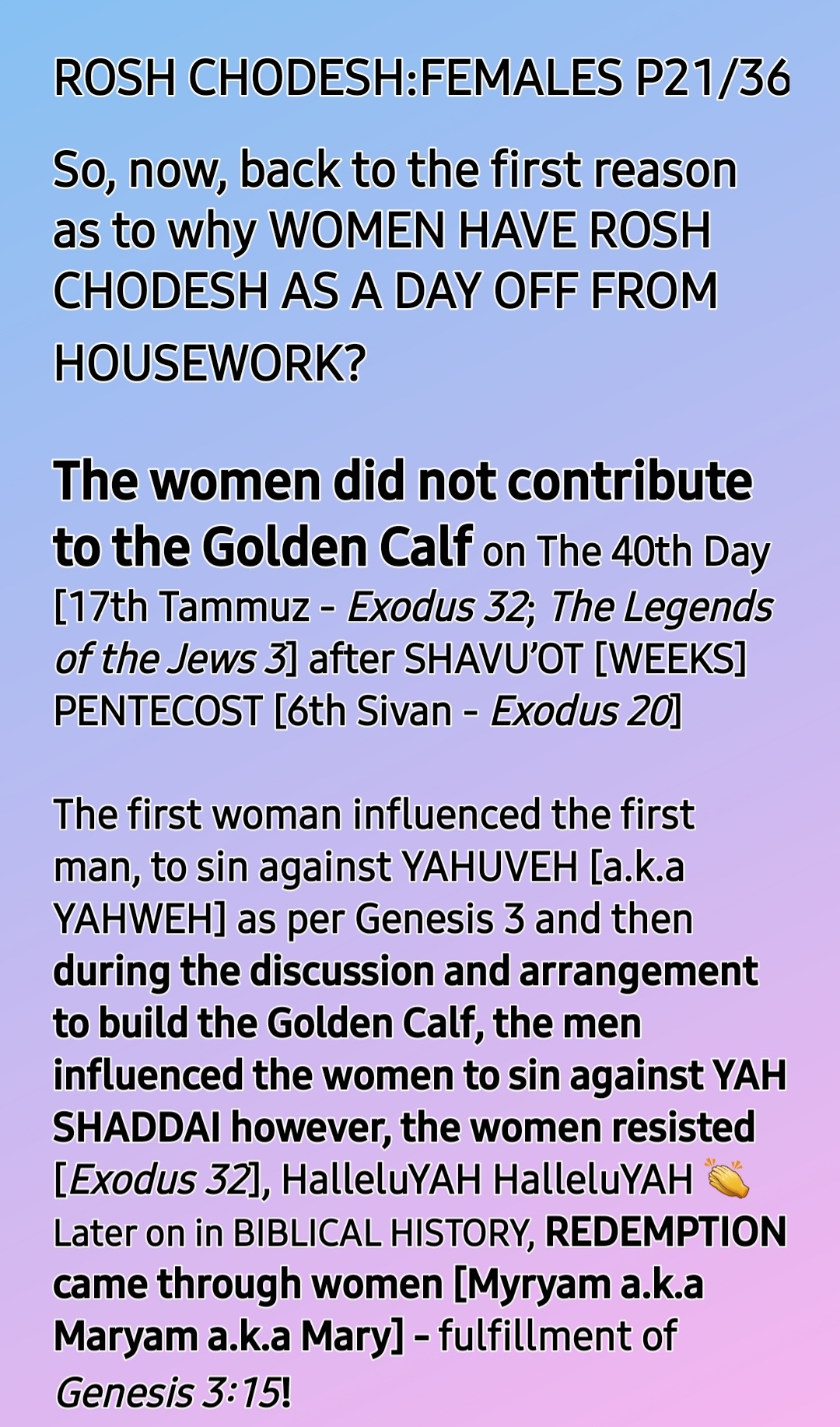 So, ROSH CHODESH [HEAD OF THE MONTH] IS BOTH WOMEN’S DAY AND MOTHERS’ DAY, the only HOLY One Instituted by THE CREATOR, YAH SHADDAI!