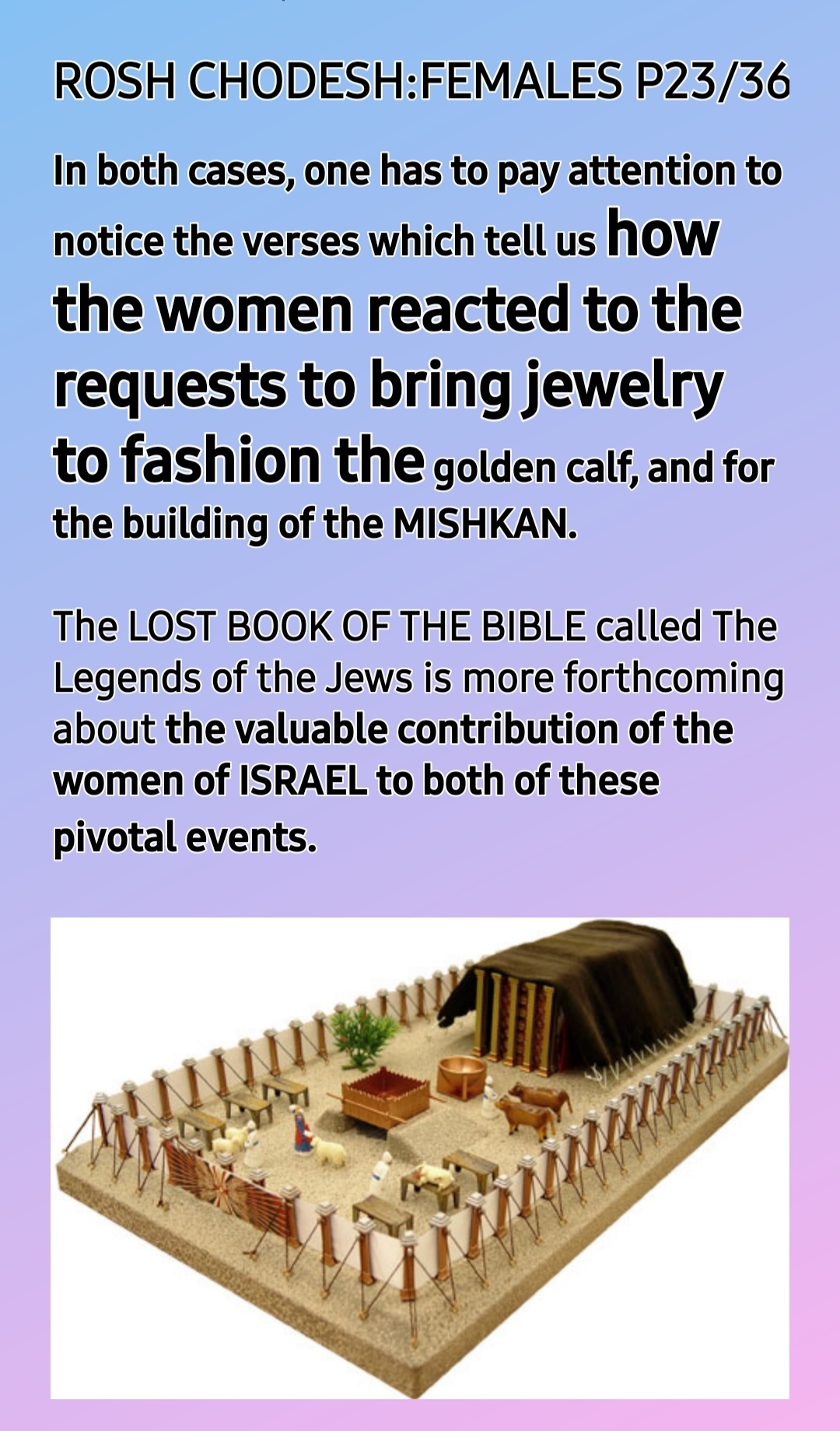 These mirrors were used by the women in Mitzrayim/Egypt to beautify themselves in order to entice their husbands, so that the HEBREW PEOPLE would continue to multiply despite the hardships of slavery (Tanhuma Pikudei 9). *These objects, on the one hand, used for physical purposes, were also spiritual objects, crucial for the perpetuation of the nation, and were considered VALUABLE CONTRIBUTIONS TO THE MISHKAN.*