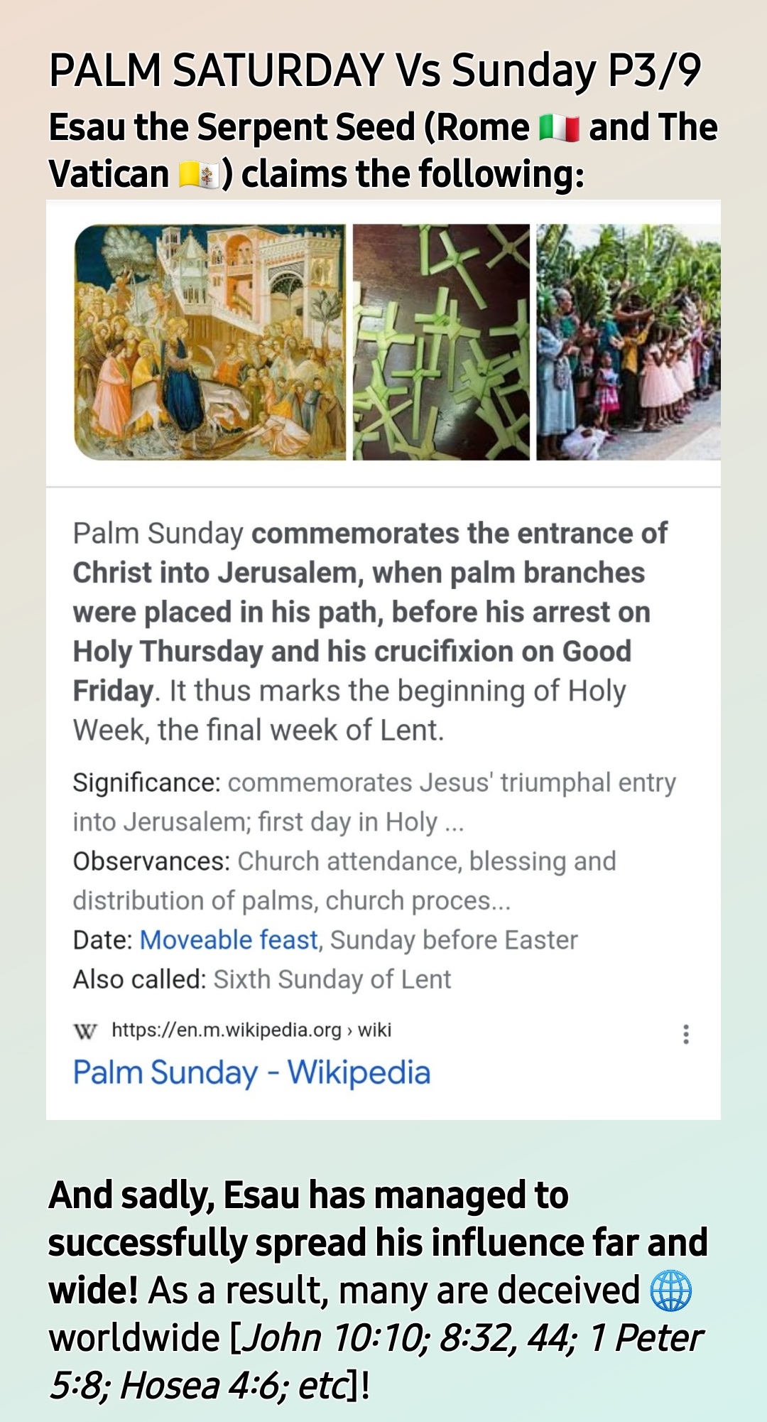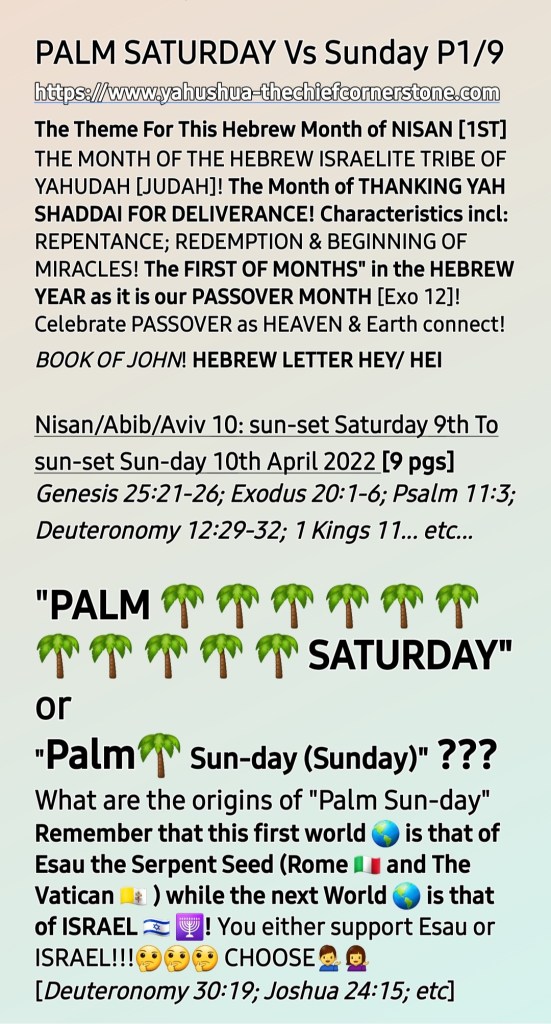 “PALM 🌴 🌴 🌴 🌴 🌴 🌴 🌴 SATURDAY” [SHABBAT HA GADOL/THE GREAT SABBATH a.k.a THE TRIUMPHAL ENTRY DAY – Nisan 10] Vs “Palm Sun-day (Sunday)”??? *Written and Audios Uploaded* 1. What are the Origins/Roots OR What is the foundation of the so-called “Palm Sunday”??? 2. Palm Sunday and Ash Wednesday Are Connected! [Psalm 11:3; Deuteronomy 12:3-5; 29-32; 30:19; Exodus 20:1-6; 1 Kings 11; Joshua 24:15; etc] – Sunday 10th April 2022/ NISAN/AVIV 9