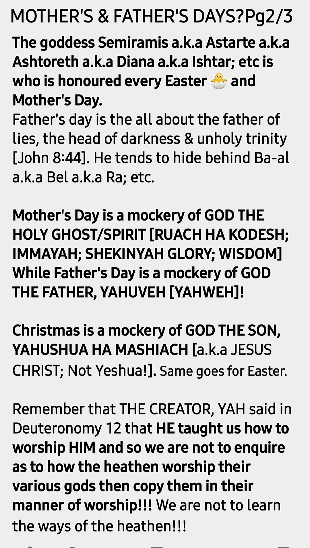 SHALOM! I am Brother Ade Israel and my wife is Sister Perpetua Shulamit. This is an online MESSIYAHNIC [MESSIANIC] HEBREW [a.k.a Jewish] PENTECOSTAL PROPHETIC MINISTRY with a HEALING/RESTORATION focus. See our TESTIMONY, VISION and MISSION STATEMENT Sections for more information on this. Welcome to our site [HOLY TEMPLE OF THE CREATOR, YAH SHADDAI without walls] created for PREACHING YAH'S GOSPEL [Matthew 28:18-20] and Sharing CRUCIAL END TIME TRUTHS [John 14:6; 8:32; Hosea 4:6]. *Please NOTE that we do not call ourselves nor anyone else who is a believer in and follower of THE ONE and ONLY TRUE MESSIAH [MASHIACH]/SAVIOUR/REDEEMER /DELIVERER who is popularly known worldwide as JESUS CHRIST [and Iesous, Jesu, Yesu, Yethu, etc] "Christian"* because we have learned through [HOLY] REVELATION from THE CREATOR/MAKER, YAH SHADDAI based on Malachai 1:1-5 and Romans 9:12-14 and Deuteronomy 12:29-32; Jeremiah 10; Ezekiel 8; etc that the terms, "Christian" and "Christianity" are Roman Vatican (Esau/Edom/Idumea) terms. *"Christian" (a tax bracket code person) actually or in fact means "A follower of the Anti-Messiah a.k.a Anti-Christ system* of Sin a.k.a Wickedness a.k.a TORAHlessness a.k.a LAWlessness System mention in 2 Thessalonians 2. *"Christianity" (a tax bracket code faith) a.k.a "Christian-Anity" is "the Vaticanisation of the Acts 2 Apostollic Foundation of Worshipping THE ONE TRUE GOD, YAH SHADDAI hence what is abominable to THE CREATOR/MAKER is widely acceptable in the name of 'the law has been done away with through nailing it to the cross', for example, Christianity encourages eating pig meat (pork, ham, bacon, etc) which is abomination as per Leviticus 11".* *Swine is a symbol of pig-mentation (skin colour) and demons love pig-mentation. Also, swine were worshiped as a deity in that location where YAHUSHUA HA MASHIACH [a.k.a JESUS CHRIST] cast the principality called "legion" out.* NOTE how the Romans introduced, established and emphasise "Easter ham" a.k.a Ishtar ham. they made it a tradition to eat pig meat 🐖 🐷 🐽 🐗 🐖 🐷 🐽 🐗 🐖 on the so-called Resurrection day of Jesus Christ, Why??? Pig meat is abomination to the LORD YAHUVEH and YAHUSHUA therefore pollutes YAH'S [GOD'S] TEMPLE (our bodies)! The Vatican is a den of demons and we are not of Rome/Esau!!!! Also, the term, "religion" = relagre = to bind back! Sadly, all roads lead back to Rome 🇮🇹 and The Vatican 🇻🇦. *Also, sadly, many of THE HOLY BIBLICAL SCRIPTURES have been Romanised and Vaticanised hence THE CREATOR/MAKER, YAH SHADDAI is calling us back to THE HEBREW ROOTS OF OUR FAITH IN HIM, HalleluYAH!* So, we call ourselves THE ORIGINAL TERM used before Roman and The Vatican changed/altered things which is: "MESSIYAHNIC [MESSIANIC] HEBREWS a.k.a JEWS"! We believe in plus followe in the footsteps of THE ONE and ONLY TRUE MESSIYAH [MESSIAH] as led by RUACH HA KODESH [HOLY SPIRIT; Not Ghost!!!] are in love with THE TORAH/LAW as per Joshua 1:8; Psalm 1; 119; Matthew 5:17-20; Colossians 2:16-17; etc. We believe in John 3:16; Romans 6:23; Isaiah 1:18-20 Matthew 28:18-20; etc as well as Acts 2; 8; etc: Genuinely Believe, Confess and Be Baptised by Immersion In Water followed➡️ by Immersion In RUACH HA KODESH then Daily Work Out Your SALVATION With Fear and Trembling [Philippians 2:12-16] while endeavouring To Be HOLY AS YAH Is HOLY [Leviticus; 1 Peter 1:16; Hebrews 12:14] and Bearing Many GOOD FRUIT FOR YAH SHADDAI [John 15; Galatians 5] !!! Once again, Welcome to our site [HOLY TEMPLE OF THE CREATOR, YAH SHADDAI without walls] created for PREACHING YAH'S GOSPEL [Matthew 28:18-20] and Sharing CRUCIAL END TIME TRUTHS [John 14:6; 8:32; Hosea 4:6]. ➡️This is our GETTR link [GETTR is the uncensored version of Twitter, just so you know] : https://gettr.com/user/yahushua7 ➡️We also have a *TELEGRAM Channel* [uncensored alternative to WhatsApp] and ➡️*MeWe* [uncensored alternative to Facebook and Instagram]! ➡️Here is our donation link if you please [if you wish to be a BLESSING to us and others in need worldwide through this online Ministry]: 📌https://www.paypal.me/AdeIsrael and/or 📌https://www.paypal.me/PNAMUTEBI ➡️Here is our donation page which explains what donations are for, if you please: https://yahushua-thechiefcornerstone.com/donations/ ➡️➡️➡️We are called and appointed by THE CREATOR, YAH SHADDAI to raise awareness of "THE JEWISH-NESS OF THE MESSIYAH [MESSIAH]" who is popularly known as JESUS CHRIST OF NAZARETH and how this affects THE BODY OF YAHUSHUA HA MASHIACH! ➡️➡️➡️THE HOLY TRINITY GODHEAD WHOM we worship are known as: 📌➡️1. GOD THE FATHER, ABBA YAHUVEH'S (a.k.a YAHWEH); 📌➡️2. GOD THE SON, YAHUSHUA [a.k.a YAHSHUA] HA MASHIACH and 📌➡️3. GOD THE MOTHER [IMMAYAH] a.k.a GOD THE HOLY SPIRIT (Not Ghost!) [RUACH HA KODESH] a.k.a SHEKINYAH GLORY [Isaiah 60:1-2; etc] a.k.a WISDOM [Proverbs 8:22-31]! Please NOTE that 2 Corinthians 13:14 is evidence of the existence of THE HOLY TRINITY GODHEAD [YAHUVEH – FATHER; YAHUSHUA HA MASHIACH – SON; IMMAYAH a.k.a SHEKINYAH GLORY – MOTHER] just as Revelation 16:13 read alongside Revelation 13 is the evidence of the existence of ⚠️the Unholy Trinity godhead (lucifer – father, Barrack Hussein Obama – son and Pope Francis a.k.a Jorge Mario Bergoglio – mother)!⚠️ There is a crucial and urgent need for increased ACKNOWLEDGEMENT/RECOGNITION and AWARENESS of the MESSIYAH [MESSIAH] JESUS CHRIST'S [Not Yeshua! ; Not YeshaYAHU!!!] HEBREW-NESS or JEWISHNESS plus how it affects us, mankind who desire to dwell with HIM for eternity. *The Left Behind during and after THE FIRST HOLY CATCHING AWAY (Not "RAPTURE" which means rape) TO THE HEAVENS will be the most affected by this issue of THE NAME OF THE MESSIAH!* It will begin to take effect during The Upcoming 3 Days and Nights of Worldwide Gross Darkness [Amos 8:9-10; Joel 2:30-32; Matthew 12:38-42; Mark 8:12; etc]. See how people gen