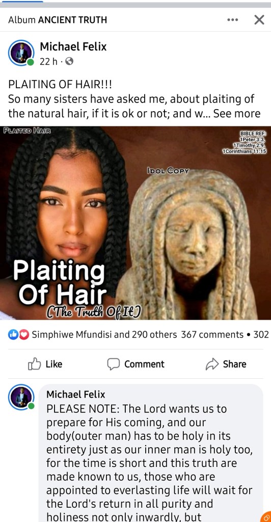 Remember that once you become born again, you are required to die to self and live to CHRIST JESUS which means, HE takes over everything concerning you, HE takes the steering while and leads the way. Part of HIS GUIDANCE on the NARROW PATH TO HEAVEN includes this PROPHETIC MESSAGE shared through Pastor Michael Felix on the PLAITING/BRAIDING/WEAVING/TWISTING OF HAIR which is forbidden by THE CREATOR/MAKER. Also, this particular message is particularly about hair. Clothing/Apparel is a whole other topic. More on this can be found on our website if you are interested in more of GOD’S WAY and not your way:
