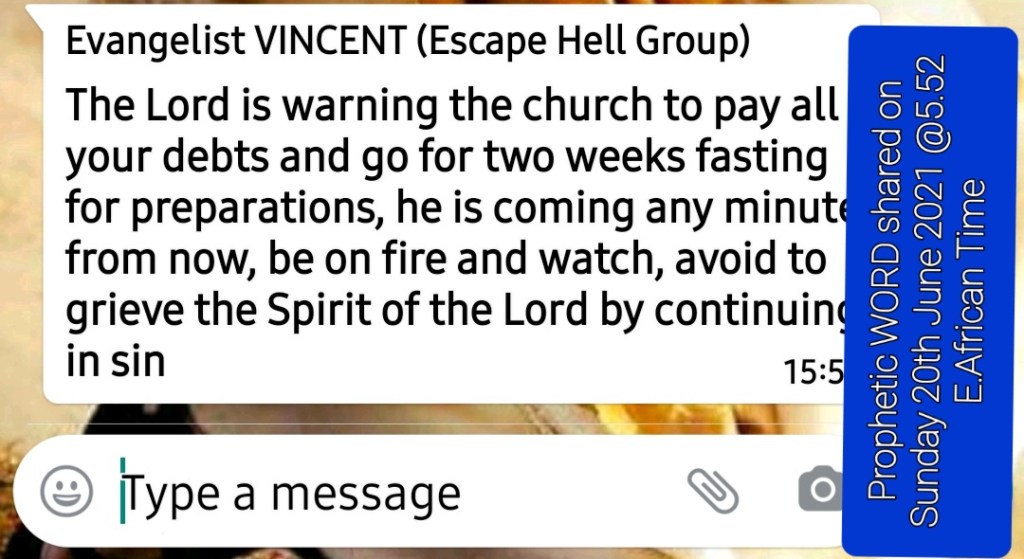 PLEASE PAY DEBTS INCLUDING LOANS, DO RESTITUTION, TAKE BACK ANY PROPERTY IN YOUR HOUSE THAT DOESN’T BELONG TO YOU, CAST AWAY ALL PROPERTIES OF THE DEVIL FROM YOUR HOUSE AND ALSO FROM YOUR BODY,. even a spoon or a plate of your neighbor is not yours take it back, no big or small sin. THE LORD IS SAYING, IF YOU HAVE A DEBT AND YOU ARE WILLING TO PAY,BUT THE OWNER OF THAT PROPERTY/MONEY REJECT YOUR PAYMENT TWICE, TAKE THAT MONEY IN THE CHURCH AND OFFER IT AS AN OFFERING OF RESTITUTION. DON’T USE THE DEBT BECAUSE THE OWNER HAVE REJECTED YOUR SETTLING OR THE OWNER HAVE DIED OR WENT FAR ABROAD, NO DEBT SHOULD REMAIN STANDING IF YOU WANT TO BE A WINNER ON THE JUDGEMENT DAY. PRAY AND ASK THE LOAD TO GIVE YOU MONEY TO SETTLE YOUR DEBTS IF YOU CANT MANAGE TO GET IT SETTLED AND WHEN YOU RECEIVE THE MONEY FOR PAYING THE DEBT, DON’T USE IT FOR OTHER THINGS. PLEASE WE ARE LATE, THE LORD IS WARNING US TO BE READY FOR HIS COMING.